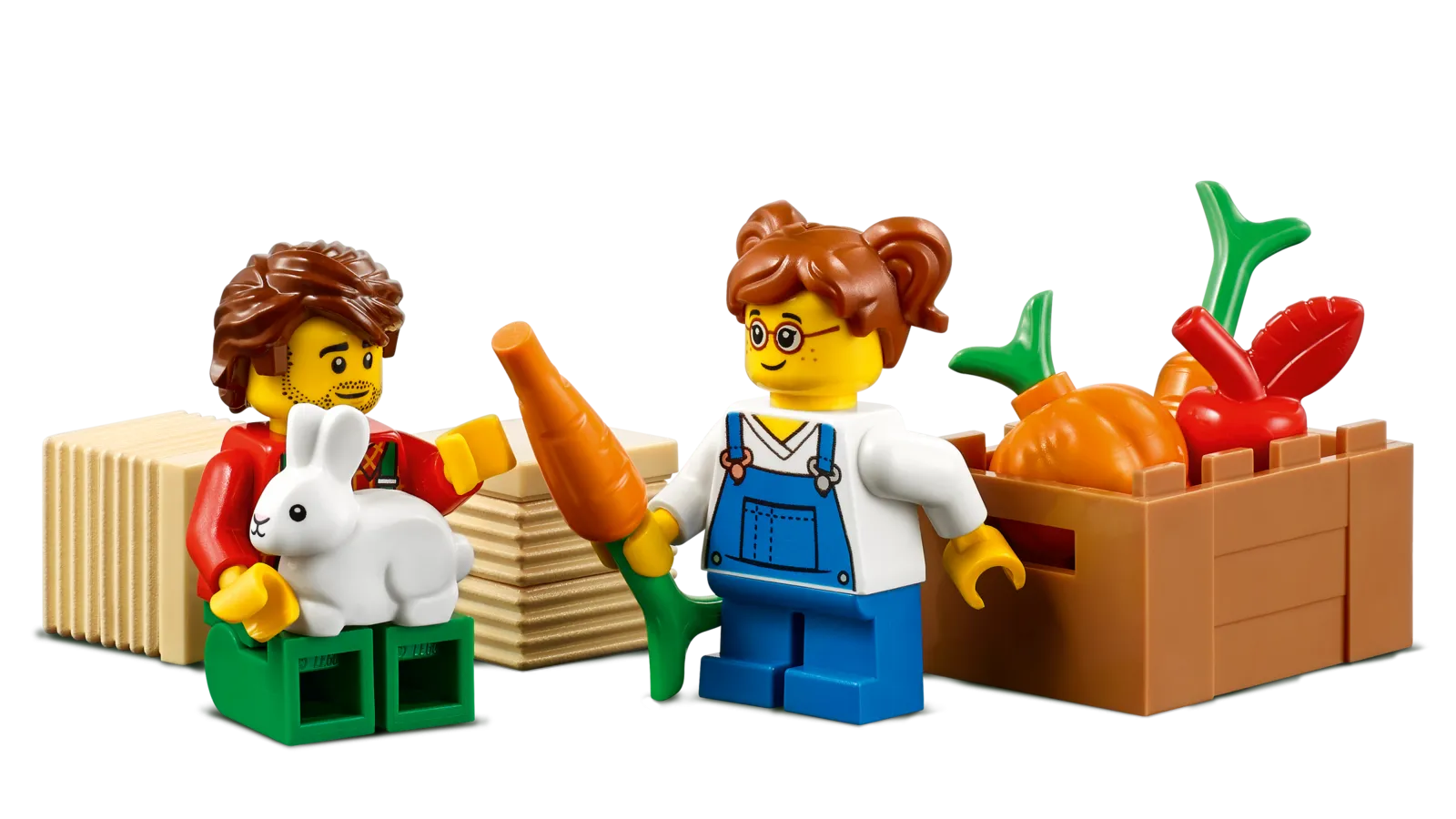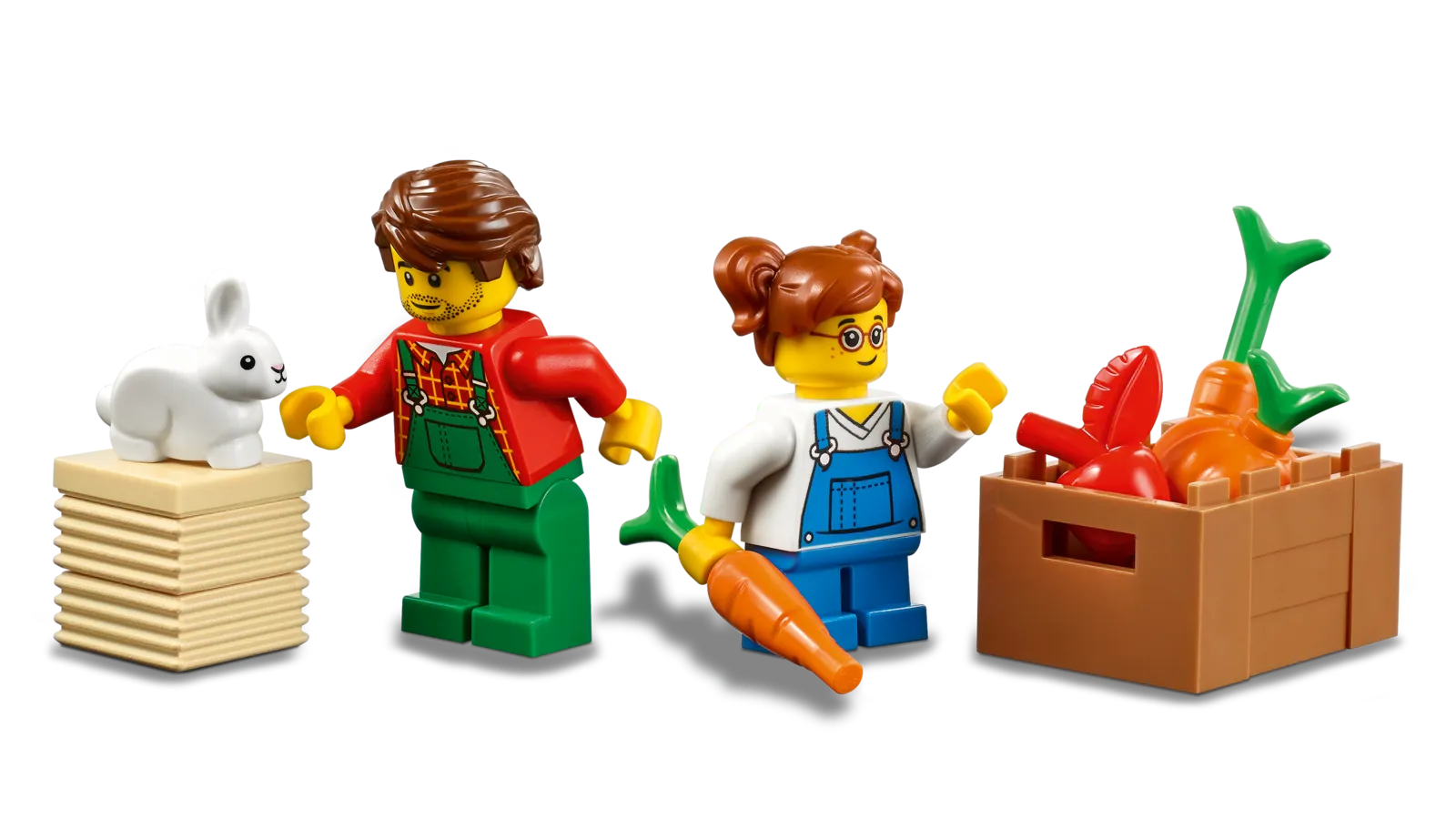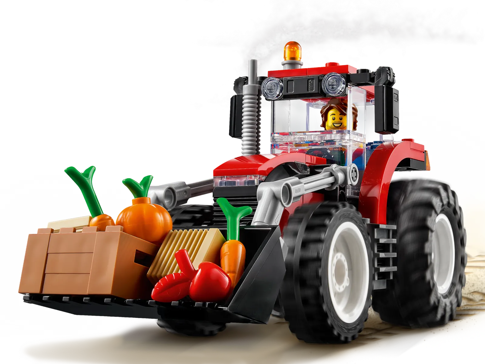 - What's in the box? Everything kids need to create a cool toy tractor with lots of realistic features, plus 2 hay bales, a crate of veggie elements, farmer and daughter minifigures and a rabbit figure.