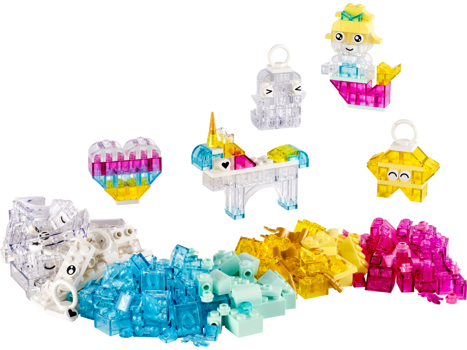 Kids begin by building heart, ghost, mermaid, star and unicorn toys. As their building confidence grows, they move onto a spaceship, cloud, shooting star, bird, narwhal, ice cream and flower. Next, they can scale up the creative fun with a large castle and dragon toy. Translucent bricks, eye and mouth pieces and hanger-bricks for display add see-through sparkle and extra creative fun to kids’ creations.
