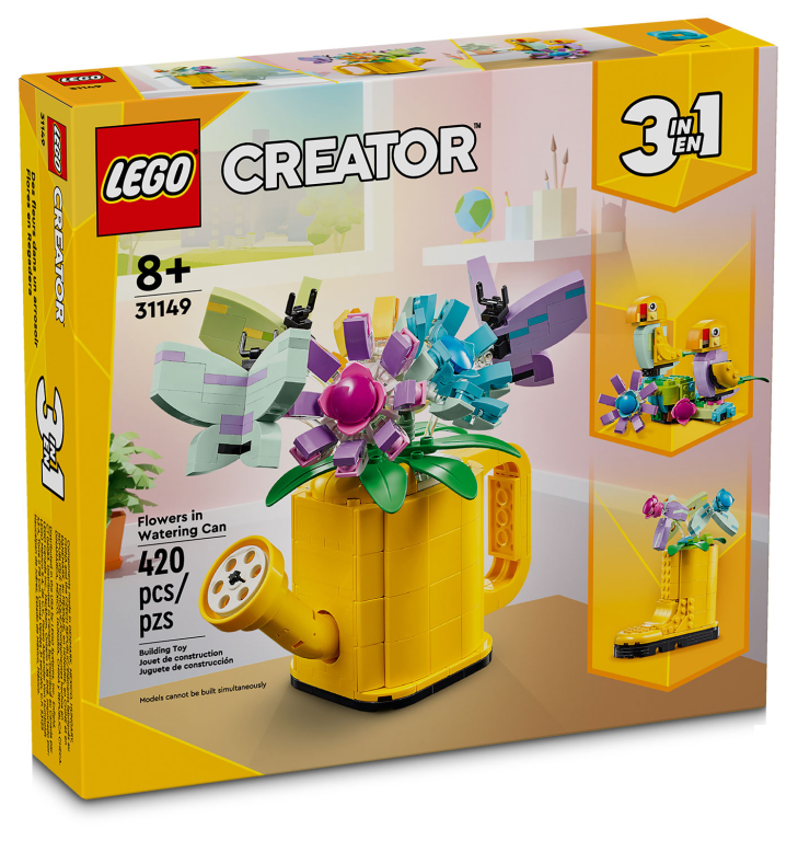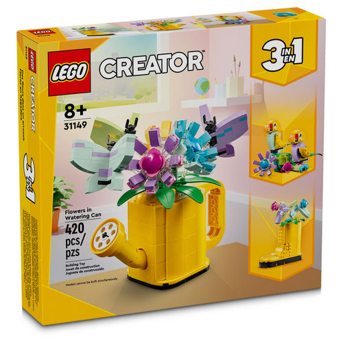 Build, rebuild, play with and display 3 colourful models inspired by nature with this LEGO Creator 3in1 Flowers in Watering Can (31149) set. It features a brick-built yellow watering can toy with a handle and spout. It's filled with 3 flower toys with movable petals and 3 butterfly toys on transparent sticks that give the impression they are flying.