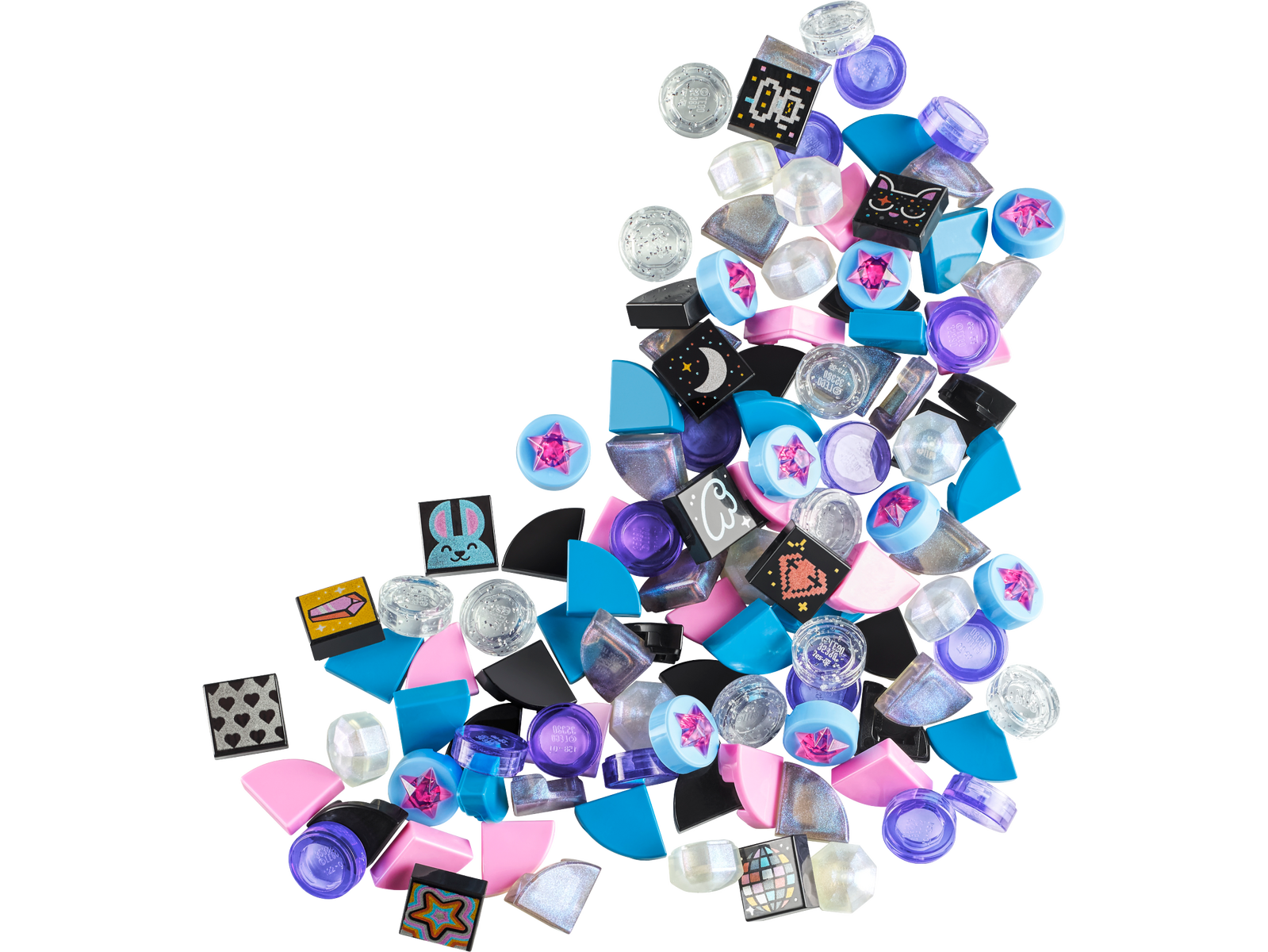This bag contains 105 colorful tiles, including colored, opalescent, glitter and 3D-effect star tiles, plus 10 graphic tiles from a range of 16 designs focused on different passions, like music, love, animals and outer space.
