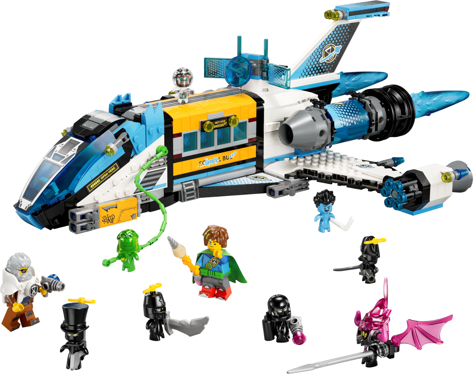 Detailed minifigures of Mr. Oz and Mateo help bring the adventure to life. Kids can load the crew into the spaceship toy and get ready for takeoff!
