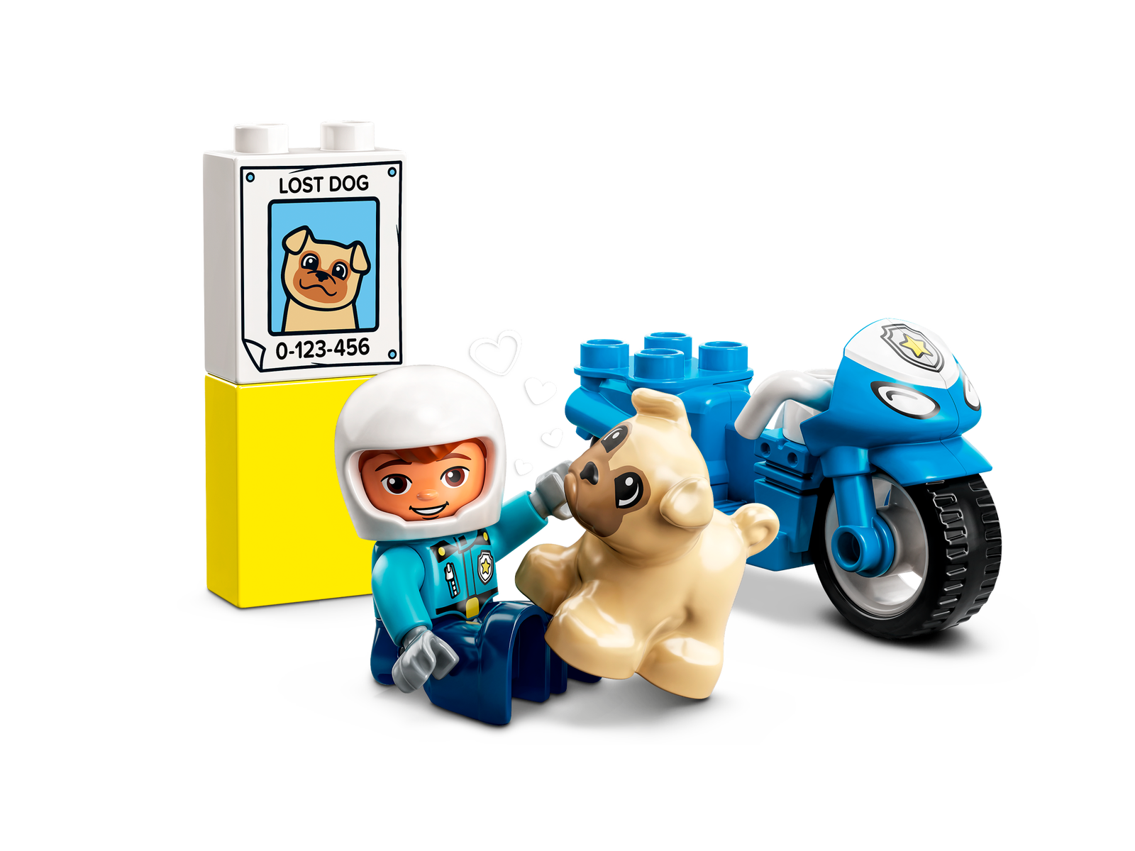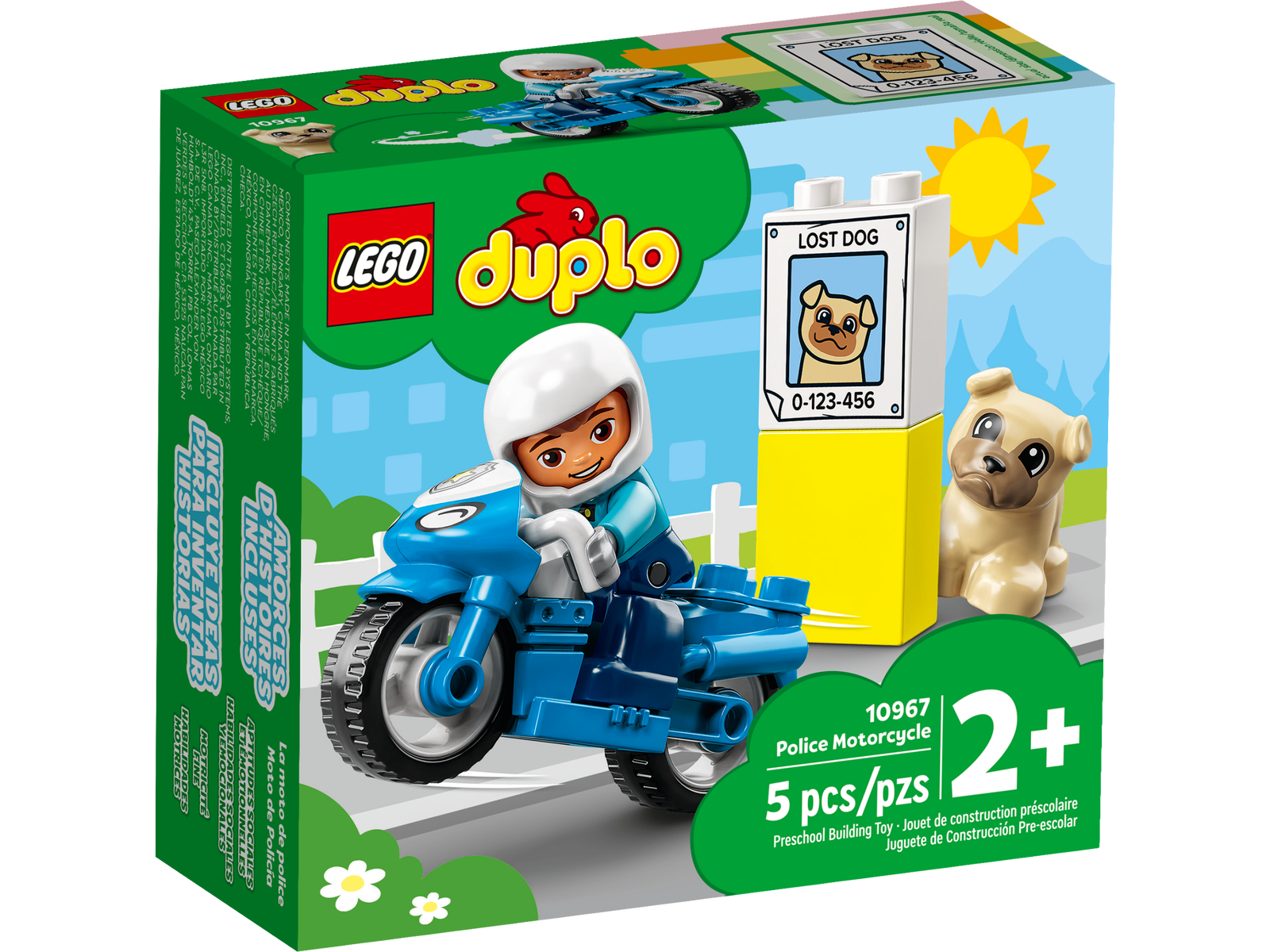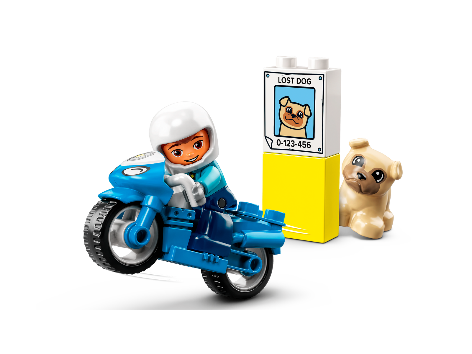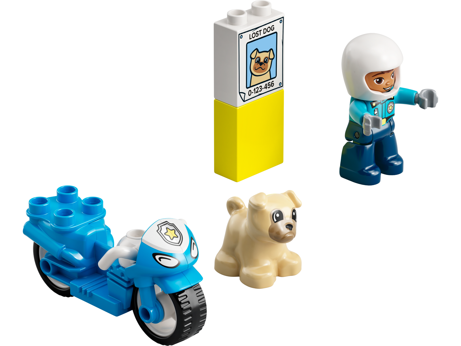 - Inspires imaginative play – The set includes 2 LEGO® DUPLO® figures – a police officer and a cute dog – a ‘lost dog’ poster, plus a cool blue police motorcycle for the officer and dog to ride on