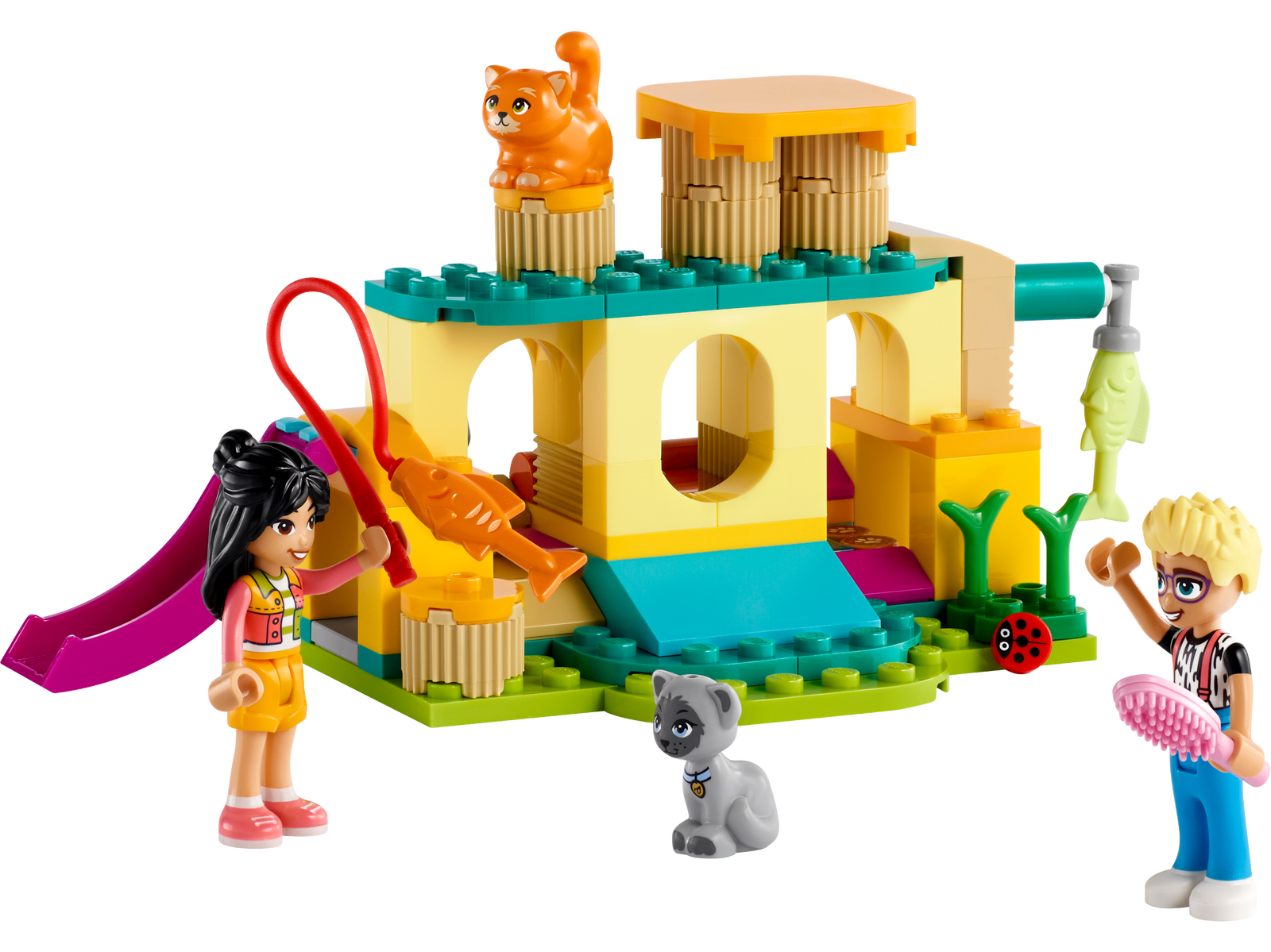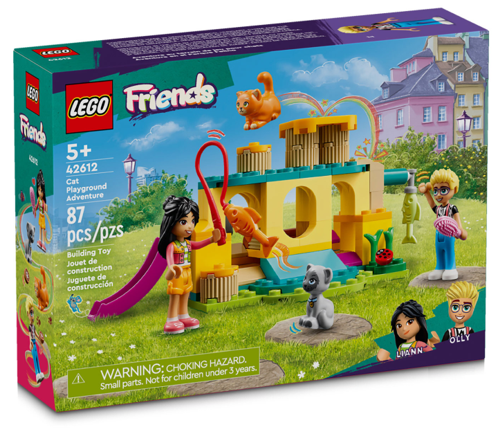 Cat fans can enjoy lots of fun with the LEGO Friends Cat Playground Adventure Set (42612) for girls, boys and kids aged 5+ who love animal toys. The set includes a buildable playground, 2 mini-dolls, 2 animal characters and pet care accessories that include a toy fish, a catnip plant, food and a litter tray.