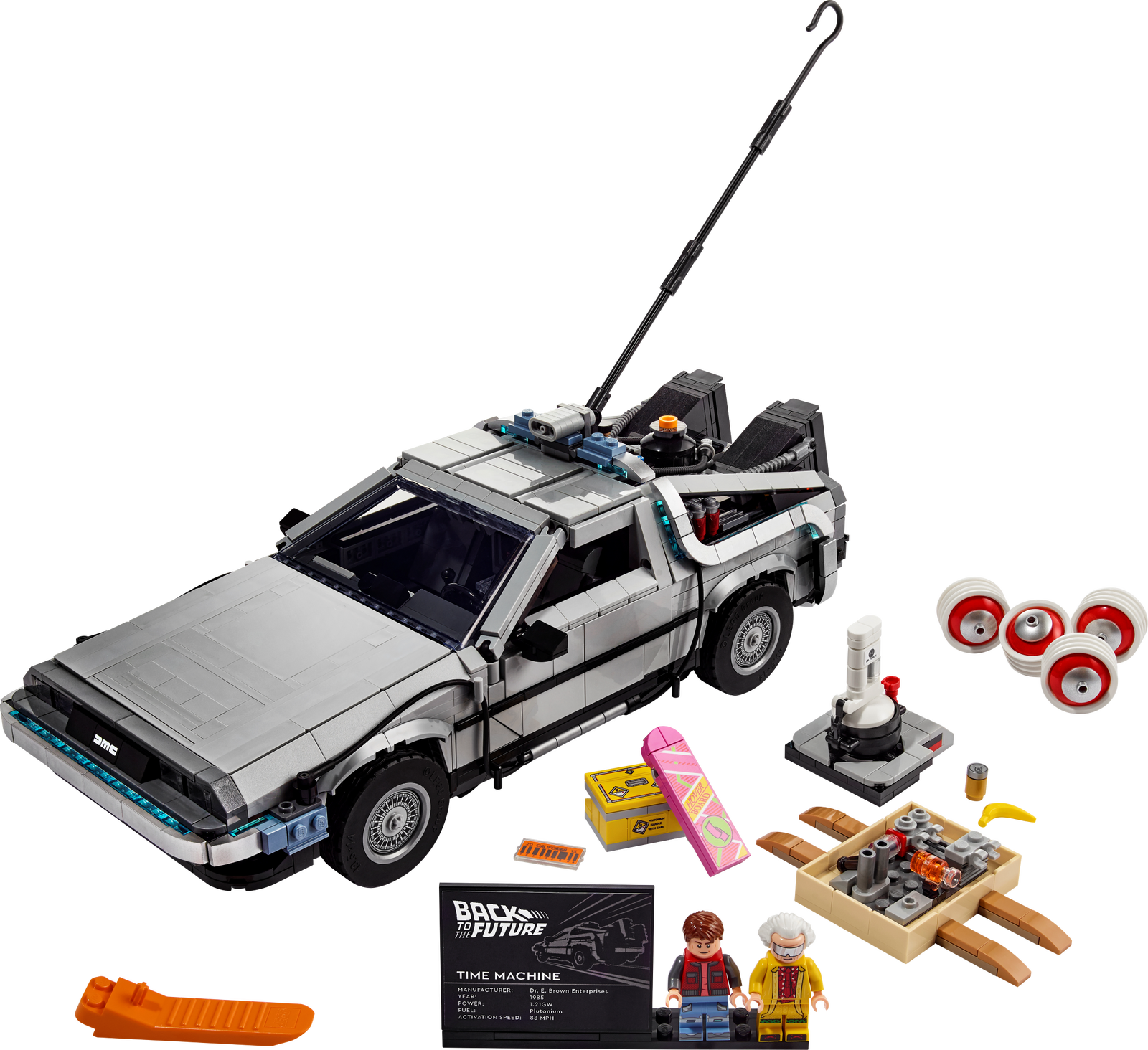 - Includes 2 minifigures, plus accessories – Spot details from the movies, like Marty’s hoverboard and the OUTATIME licence plate. Comes with Doc and Marty McFly minifigures to add to your display