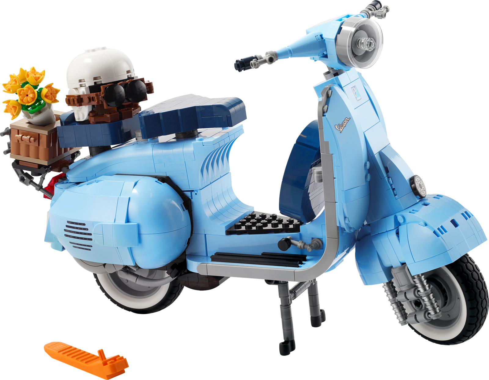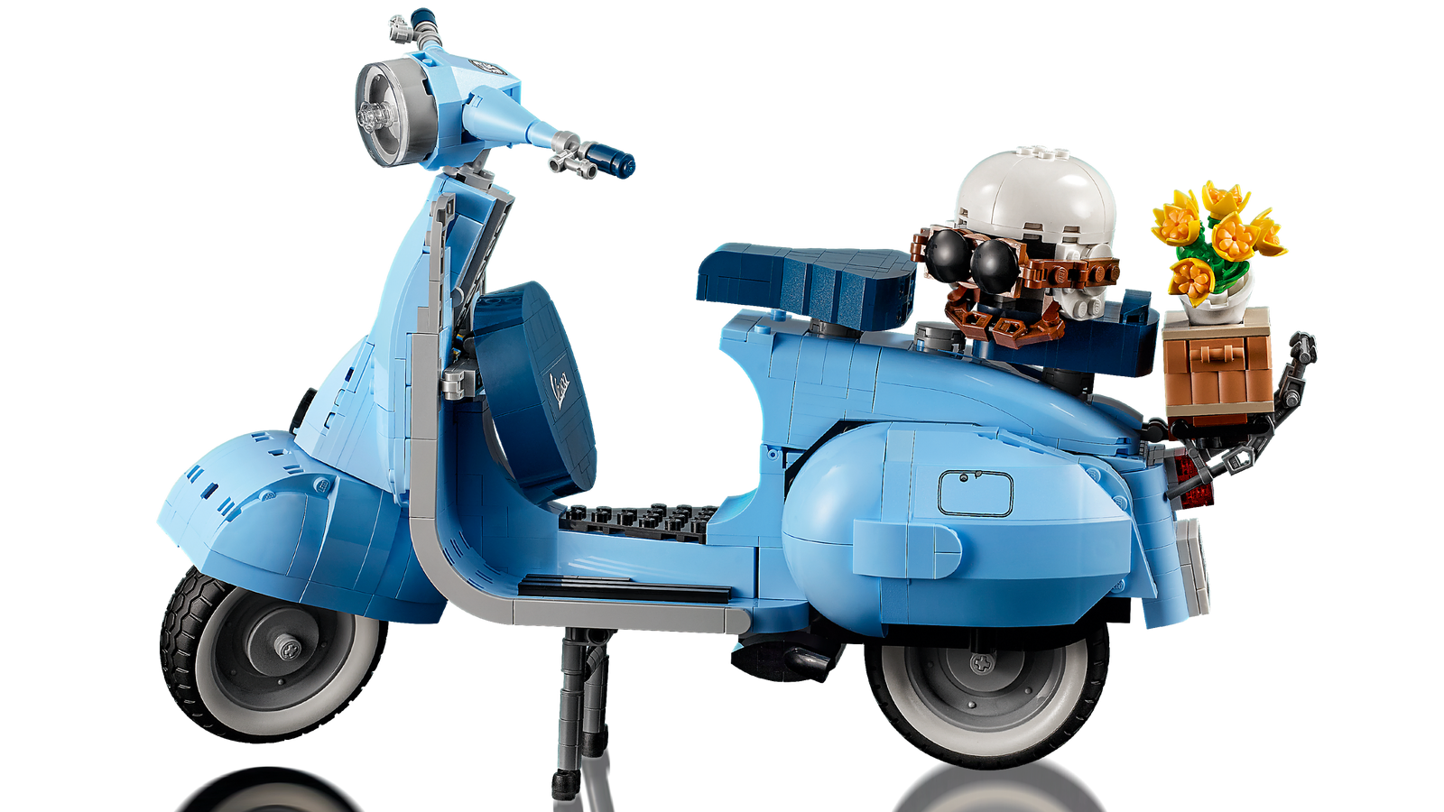 Like the original, this buildable model Vespa features a front wheel mounted on one side, 2 seats, a removable engine cover with a brick-built engine beneath, a functioning kickstand, plus working steering. Finishing touches include the Vespa logo, a classic 1960s Italian licence plate, a spare wheel, a helmet, plus an accessories basket including a flower bouquet on the back.