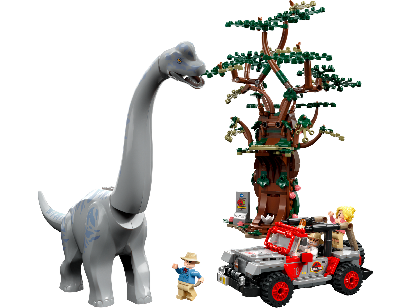 - Buildable tree The tree features a viewing platform for up to 3 minifigures and detachable leaves to feed to the Brachiosaurus. There is a warning sign next to the tree