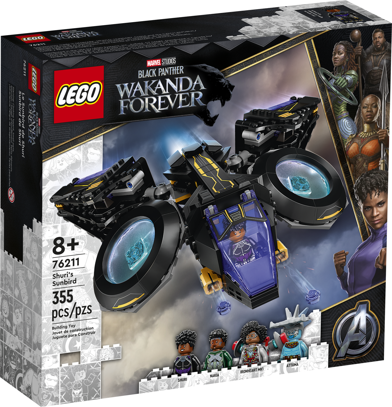 LEGO® Marvel Shuri's Sunbird (76211) looks as amazing as it is for kids to play with. Put this aircraft in the hands of a Black Panther fan aged 8 and up and watch their imagination soar! The best for both play and display This impressive aircraft is an authentic recreation of Sunbird, the fantastic flying machine piloted by Shuri from Marvel Studios’ Black Panther: Wakanda Forever. This versatile and powerful-looking piece of Super-Hero equipment features 2 large engines on ball joints that kids can tilt and rotate to a variety of angles. Hinges allow the wings to be folded forwards and backwards. At the rear is storage for Shuri's fist weapons, and 2 stud shooters are mounted at the front. The set includes 4 minifigures – Shuri, Ironheart MK1, Nakia and Attuma – along with their cool weapons and accessories. Wakanda forever! – Put the LEGO® Marvel Shuri's Sunbird (76211) into the hands of a Black Panther fan and take their imagination to Wakanda and far beyond 4 characters – Includes Shuri, Ironheart MK1, Nakia and Attuma minifigures, plus a spear, fighting rings and jetpack. The buildable Sunbird includes 2 stud shooters, rotatable engines and foldable wings Easily adapts for action – The adjustable engines and wings let kids reconfigure the aircraft for different play scenarios with the 4 characters and accessories Gift for Marvel fans – A birthday or holiday gift for young Super Heroes aged 8 and up Sky-high adventures – The Sunbird aircraft measures over 2.5 in. (7 cm) high, 10.5 in. (27 cm) long and 10 in. (26 cm) wide and integrates easily with other LEGO® Marvel building toys Boosts creativity – All LEGO® Marvel building toys provide young Super Heroes with premium-quality playsets designed to deliver endless imaginative play possibilities Quality guaranteed – LEGO® components fulfil stringent industry quality standards to ensure they are consistent, compatible and connect and pull apart easily every time Safety assured – LEGO® components are dropped, heated, crushed, twisted and analysed to make sure they satisfy rigorous global safety standards