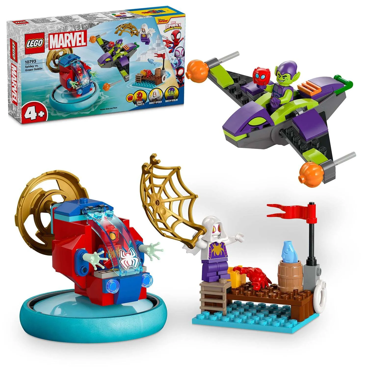 Treat kids to the LEGO® 4+ Spidey vs. Green Goblin (10793) Super Hero toy vehicle action set. This Marvel Spider-Man toy is specially designed to build confidence, improve problem-solving skills and inspire kids, boys and girls aged 4+ to enjoy endless imaginative play. This Disney+ Spidey and His Amazing Friends toy vehicle set includes: a Spidey minifigure and his hover spinner with rotating propeller and lift-up cockpit; a Green Goblin minifigure and his glider with pumpkin projectiles; and a Ghost-Spider minifigure with her large, golden web element. There’s also Spidey’s robot friend Trace-E, sea accessories and a cute crab. The set comes with a cockpit Starter Brick to help get building underway and intuitive instructions in the form of a colourful picture-story guide. Inside the box, each bag contains bricks for a quick-to-build model and character, so play gets started fast. 4+ toys are the perfect way for adults to share building fun with youngsters. Disney+ Spidey and His Amazing Friends toy – Spidey vs. Green Goblin toy vehicle set designed to meet the passions and capabilities of young Super Heroes, Spider-Man fans, kids, boys and girls aged 4+ Marvel heroes and vehicle toy set – Includes Spidey, Green Goblin and Ghost-Spider minifigures for action play, plus a large Starter Brick to make building quick and fun Movable toys for kids – The playset features Spidey’s hover spinner with rotating propeller and lift-up cockpit and Green Goblin’s glider toy Spider-Man toys ­– Authentic elements from the TV show include Spidey’s robot friend Trace-E, pumpkin projectiles, a golden web element, sea accessories and a crab Spider-Man gift for kids – With its Starter Brick and simple building steps, you can give this toy vehicle set to any young builder or Super Hero fan Expand the fun – Check out the extensive range of compatible LEGO® 4+ vehicle toys and LEGO Marvel playsets Preschool buildable toy – LEGO® sets for 4+ year olds introduce children to a universe of movie favorites, TV characters and everyday heroes 4+ vehicle set – This portable playset has 84 pieces and Green Goblin’s glider measures over 1 in. (3 cm) high, 3 in. (8 cm) long and 5.5 in. (14 cm) wide