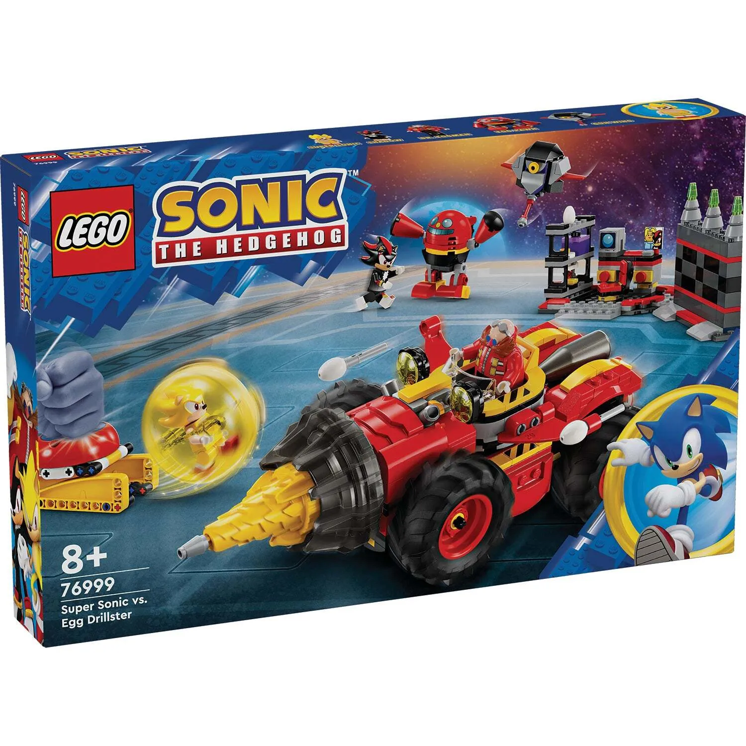 Supercharge the imaginations of video game fans aged 8+ with a Super Sonic vs. Egg Drillster (76999) building and adventure hero playset. This collectible LEGO® Sonic the Hedgehog™ video game toy gift features an Egg Drillster vehicle with a rotating drill bit and a dock for the detachable hover vehicle, a speed sphere launcher and speed sphere, plus a lab with a breaking wall. It also includes 7 video game toy characters: Shadow, Super Sonic, Dr. Eggman, a Pocky, a Pecky, an Egg Pawn Badnik and a ’reprogrammed’ Gun Wing.