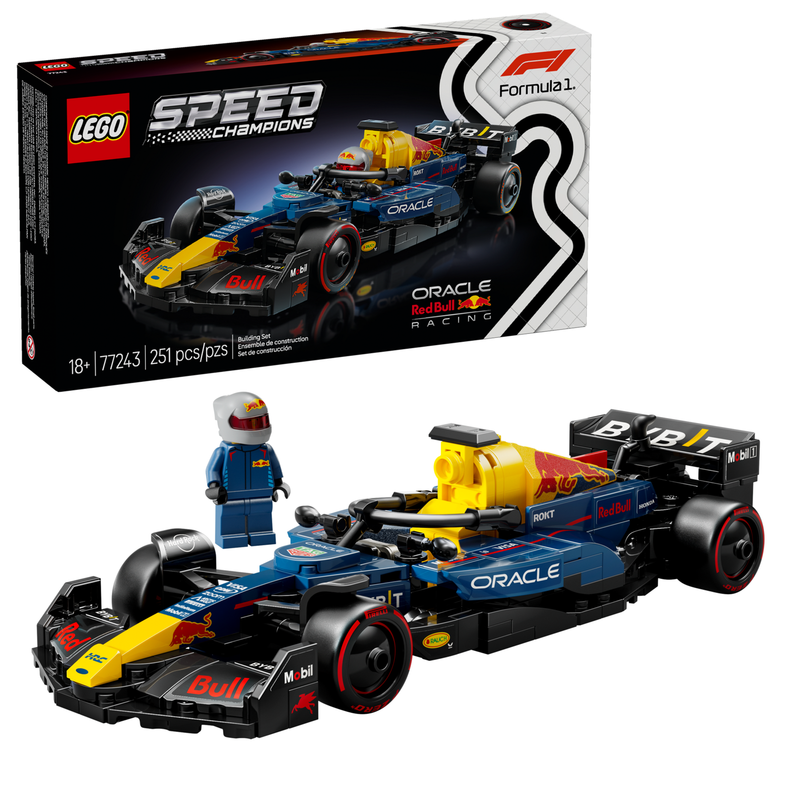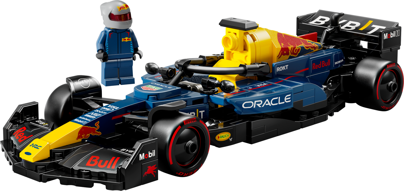 - F1® minifigure – The vehicle kit includes an F1 driver minifigure wearing a Red Bull outfit and a winged helmet to place inside the F1 race car’s cockpit
