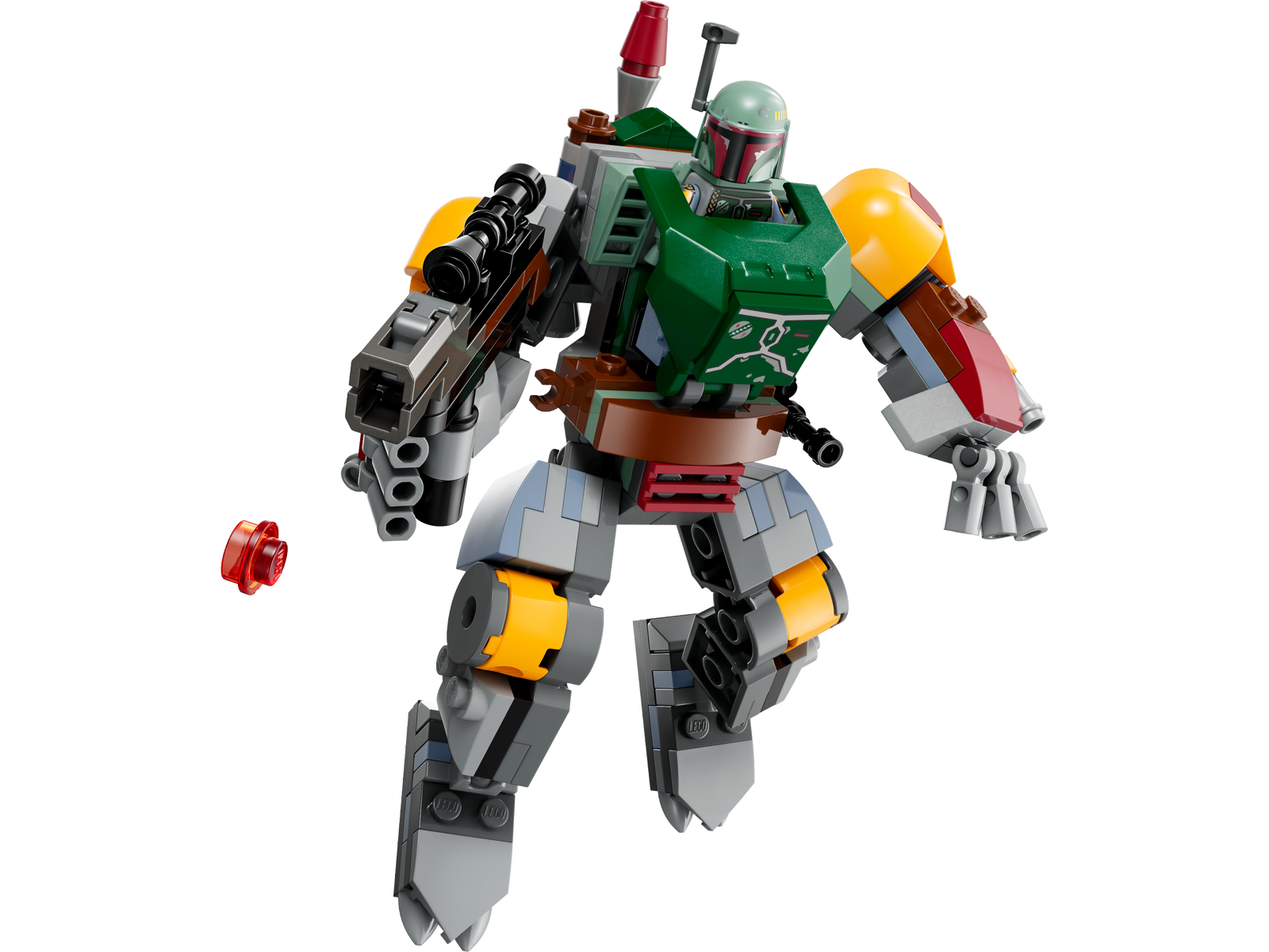 - A Boba Fett LEGO® minifigure – Boba Fett comes with a blaster rifle and jetpack accessory element. The blaster rifle can be clipped to the mech, and Boba can wear the jetpack in the cockpit