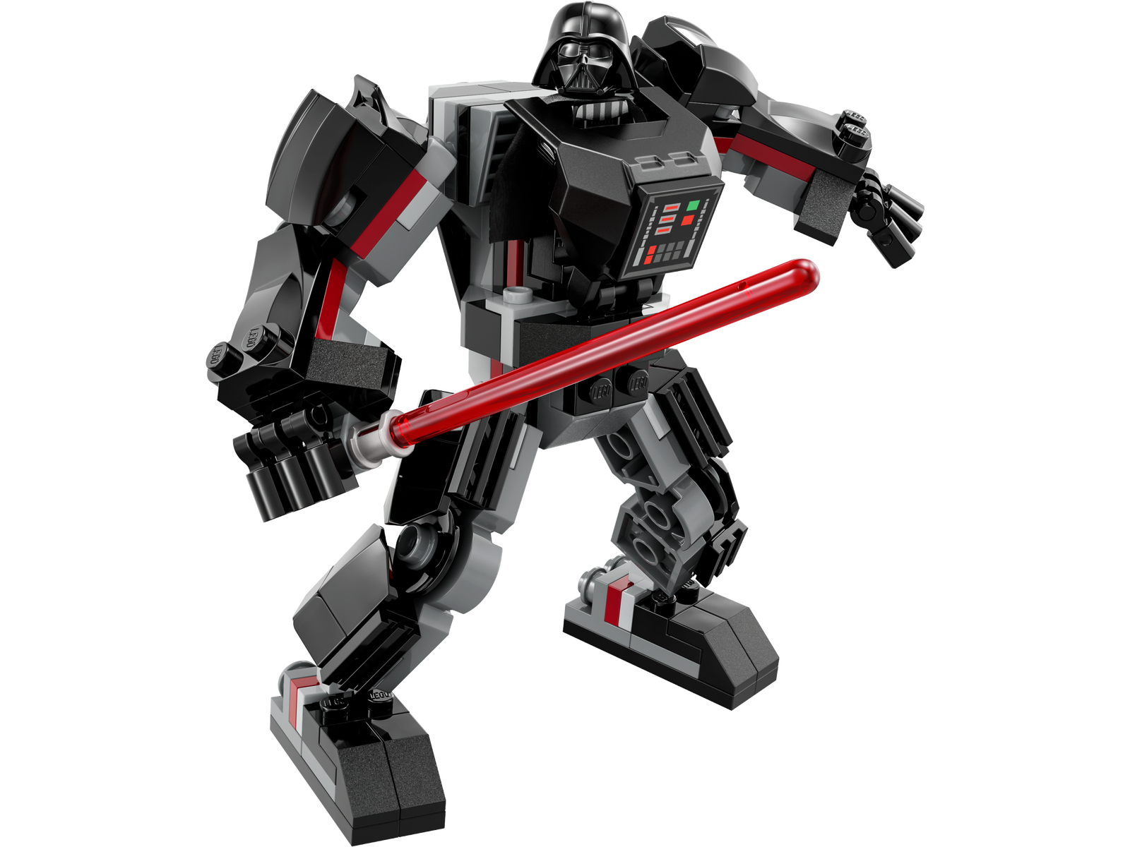 - Posable mech suit – This buildable mech toy has posable hands, arms, legs and feet, an opening minifigure cockpit, a large red lightsaber and a clip for the Darth Vader LEGO® minifigure’s lightsaber