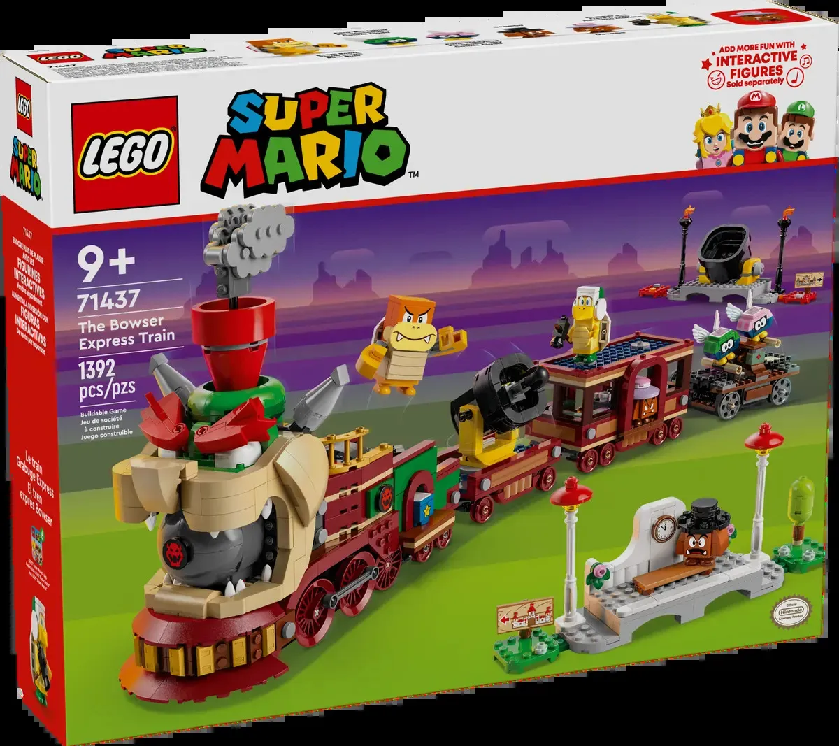 Add a LEGO® Mario™, LEGO® Luigi™ or LEGO® Peach™ figure (not included) for interactive play. Help them to chase the train in the handcar, operate the spinning platform on the locomotive and activate the cannon wagon’s spring-loaded shooter. Once all the enemies are defeated, trigger horn sounds as they drive Bowser’s Express to the station.