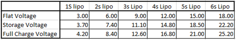 The voltage of your LiPo battery is linked to the number of cells (S) contained within the battery pack. They go up in increments of 3.7V and generally, you will find Lipos from 3.7V (1S LiPo) to 22.2V (6S LiPo).