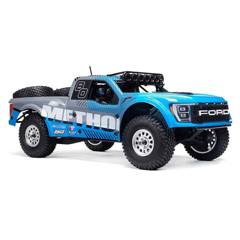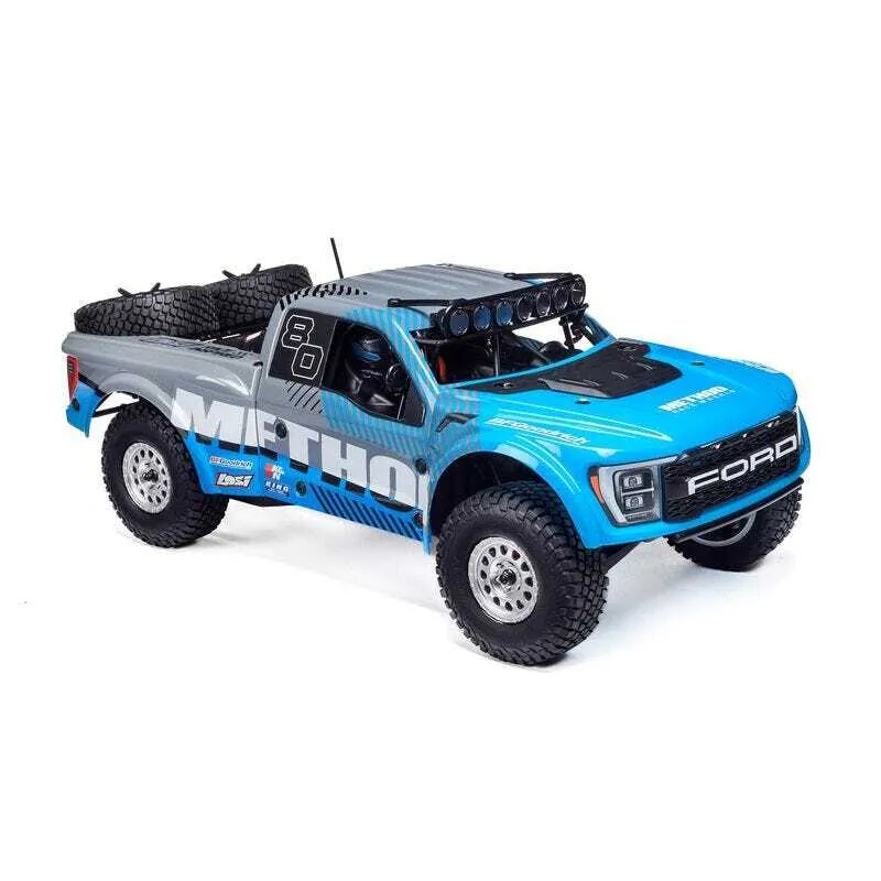 Losi works with Baja's best brands to bring you the most scale RC desert trucks possible. The Method Ford Raptor Baja Rey 2.0 captures the updated 2023 Ford F-150 Raptor R's aggressive body styling in the front grille, hood vent, fire extinguishers, driver helmets, jack, mirrors, interior, and other molded details.