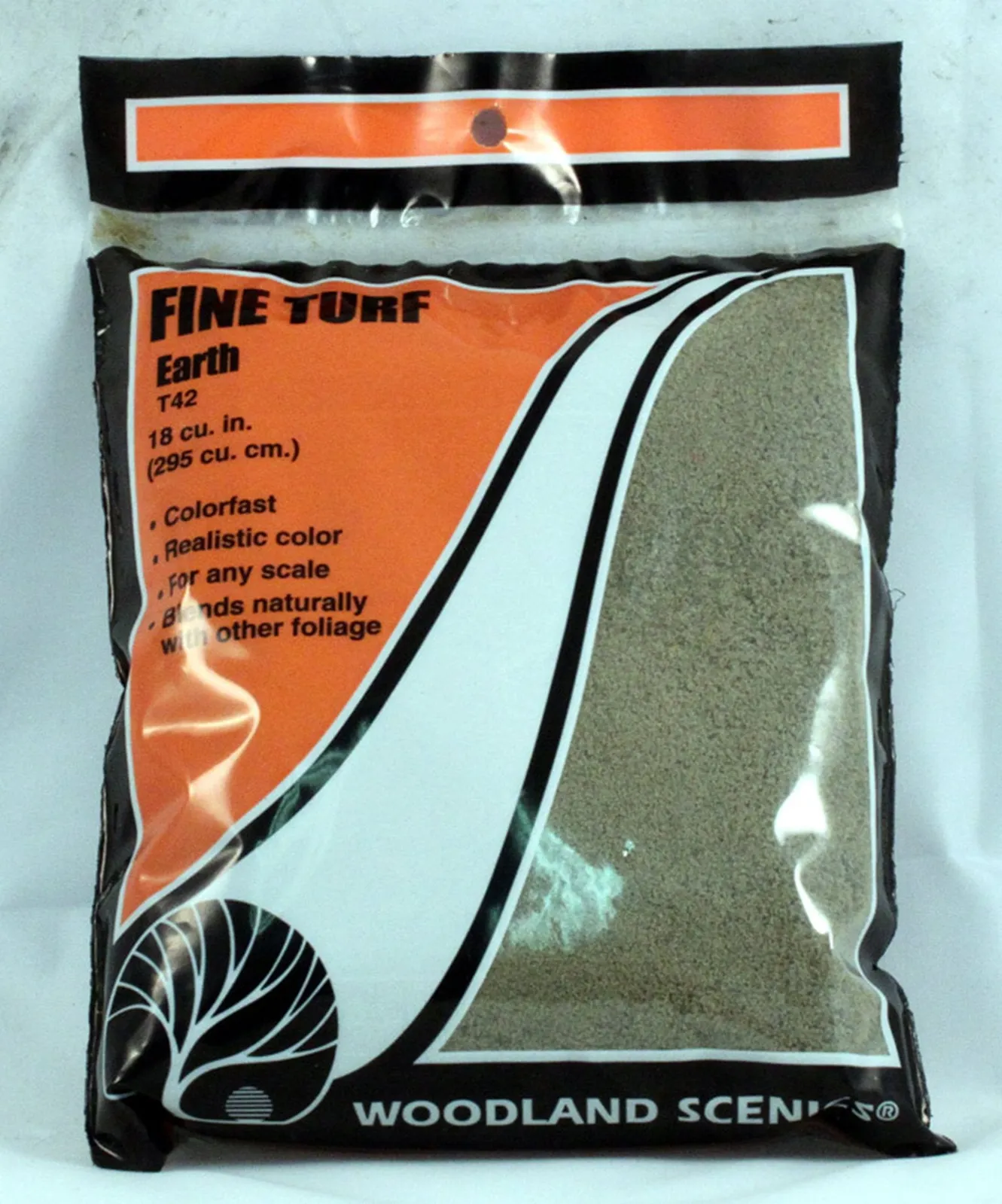 Use Earth Fine Turf to model realistic grass, low ground cover and for highlighting and accenting landscape. It is colourfast and blends naturally with other foliage. Use for any scale. T42 - Fine Turf Earth Bag - 21.6 in 3 (353 cm 3 )