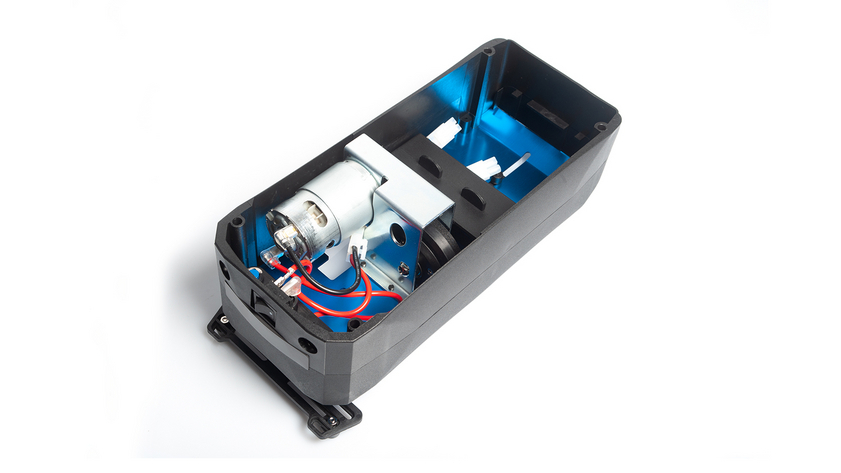 Solid technology, blue anodized top plate, powerful 750 size motor that drives the extra high, robust rubberized flywheel with 14.4V (12V operation also possible), for reliable starting of completely new and already run-in engines. And where are the bodyclips during the starting procedure? On the magnetic strip above the switch!