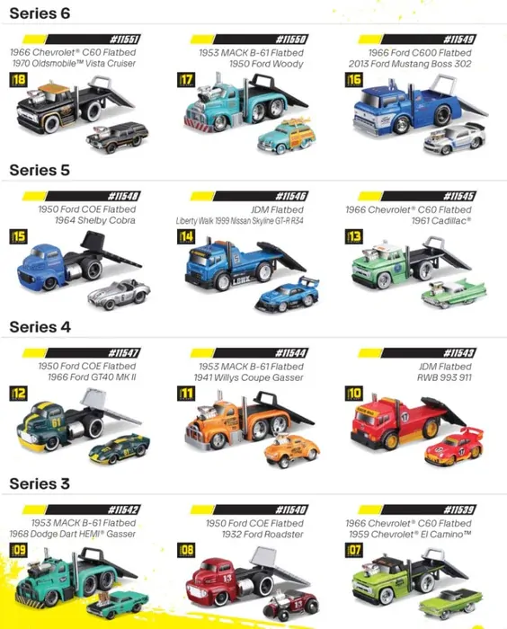 A first in Muscle Machines history, car haulin' Muscle Transports are hitting the streets! Paired with themed vehicles on their beds, these 1/64 sets are sure to be show-stoppers. Two vehicles included. Diecast metal body with plastic parts. Famous stylised look.