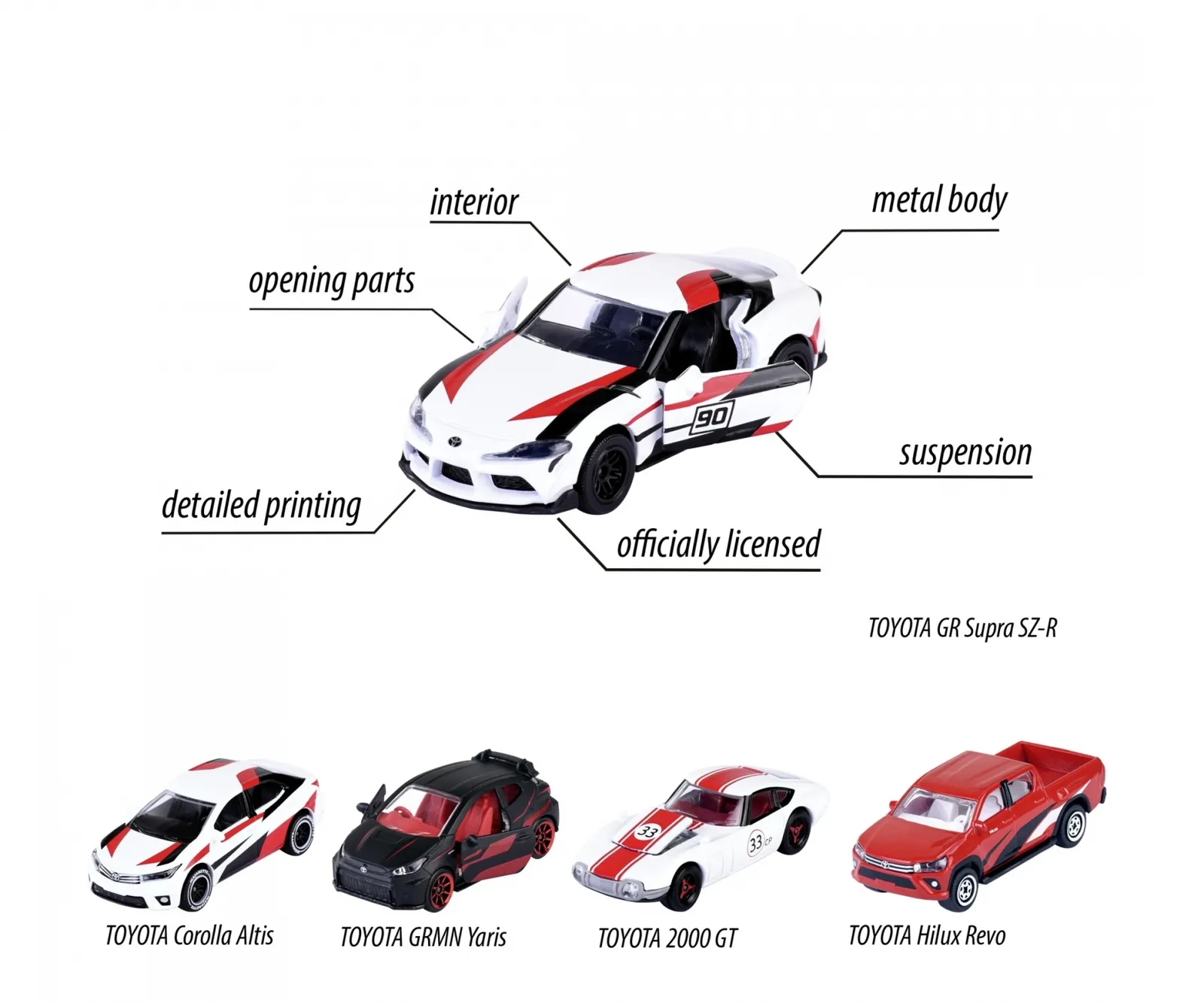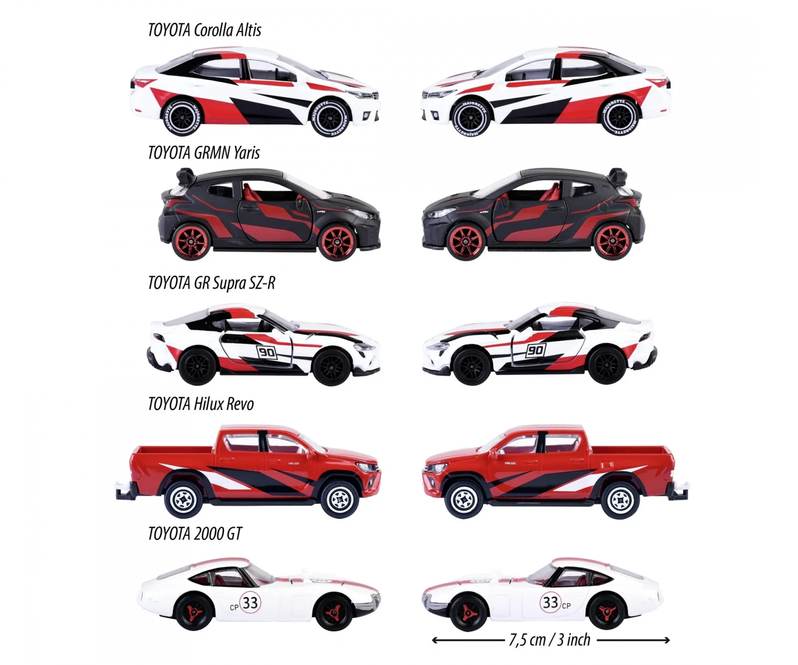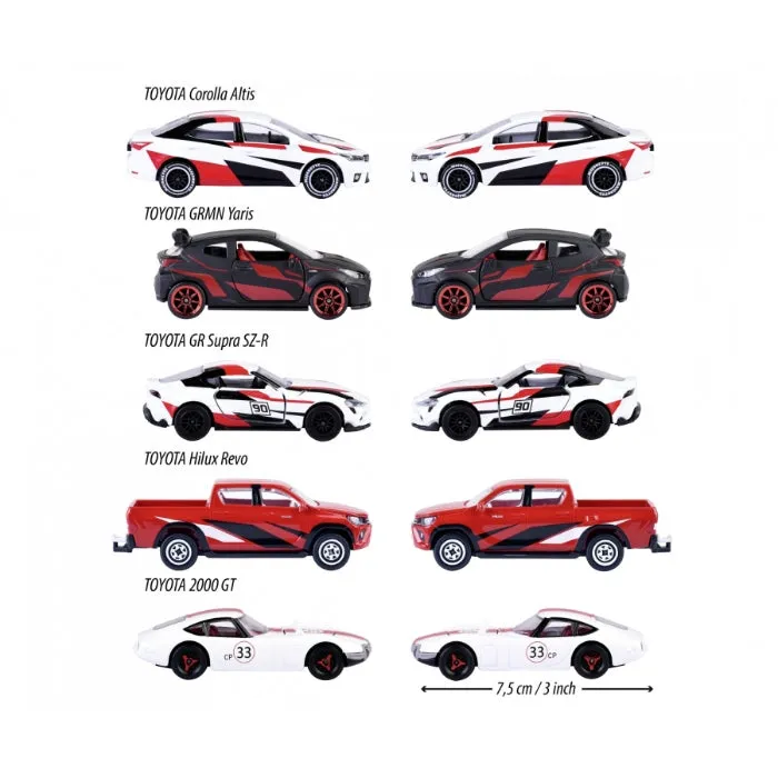 Conquer the race track with these officially licensed Majorette Toyota racing cars: These five eye-catching die-cast vehicles are guaranteed to become the highlight of your model vehicle collection! This unique selection of toy cars showcases the diverse range of Toyota vehicle models, from sport coupé to limousine.