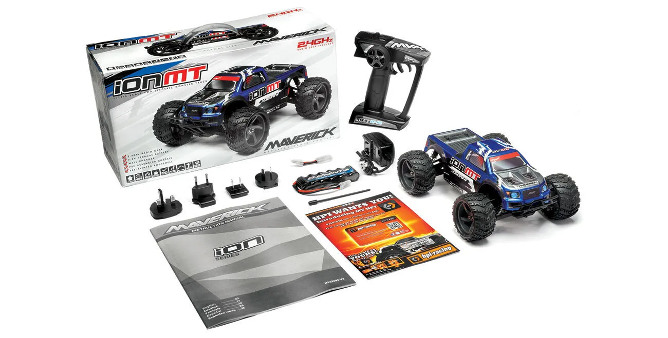 Included itemsMaverick 1/18 ion MT RTR RC Truck. 2.4Ghz Transmitter. 1200mAh NiMH Battery. USB Charger.