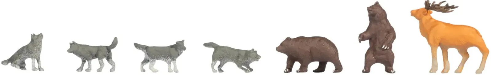 Bears and wolves symbolise the power and originality of nature like few other animals. With the “Bears and Wolves” figures by NOCH, you bring this fascination into your model landscape. The animals are shown in typical, natural poses – alert, in motion or calmly observing their surroundings. The result is a scene that feels as if it were taken straight from the wilderness. As is typical for NOCH, the animal figures are carefully painted and rich in detail, developed and designed in Germany. Fur textures, body shapes and proportions are realistically crafted, creating an authentic and respectful depiction of these impressive wild animals. The figures offer a wide range of applications. In model building and on model railways, bears and wolves bring forests, mountain regions or remote track sections to life. They are also ideal for dioramas, decoration or macro photography, as they provide strong and atmospheric motifs. Combined with other animal figures or people from all walks of life from the NOCH figure worlds, they help create a varied miniature world where nature and life come together realistically. Please Note: this is also suitable for OO gauge layouts