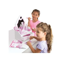 Add glamour and style to playtime with these wooden beauty essentials for make-believe makeovers! The 18-piece set includes a sturdy white and pink vanity with mirror and storage drawer. The wooden pieces include a hair dryer, hair spray, hair straightener, flip-top lotion bottle, lipstick, two nail polish bottles, blush, makeup brush, eye shadow and applicator, comb, and brush. A reusable spa services card lets kids three and older get the full salon experience by customising makeovers for themselves, friends, stuffed animals, and dolls!