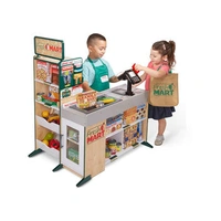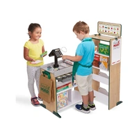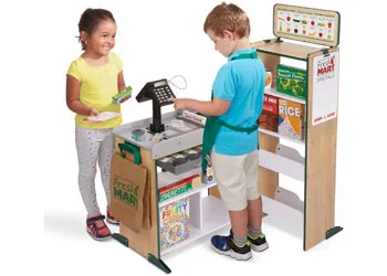 Shopping and playful purchasing is exciting at the sturdy wooden Fresh Mart Grocery Store! The free-standing play space with smooth, curved corners and edges lets customers three and older browse the shelves and pay for purchases on one side, and allows the grocer to ring up items on the other. Realistic features include beeping "scanner," a hand-crank conveyor belt, a card-swiping machine, a keypad/calculator, and cash drawer. Kids are sure to find everything on their shopping list at this friendly neighborhood grocery store!