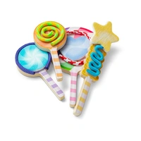 Sweeten up up playtime and feed hungry imaginations with this reusable wooden, felt, and fabric play food lollipop-decorating set with wooden display and storage tray and play money.