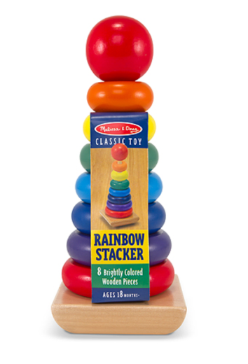 Talk about a classic childhood toy! All the colours of the rainbow are represented by these eight smooth, easy-grasp wooden pieces. Stack them on the solid-wood base, designed with rocking edges for safe and intriguing play.