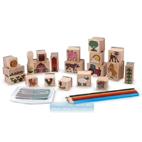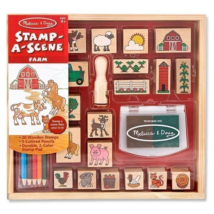 It’s a complete arts & crafts activity and storytelling kit in one! • Stamp a scene and then colour it in! • 20 Rubber-faced, Wooden-handled outline Stamps • 5 Coloured Pencils • Durable, 2-colour Stamp Pad • Everything packed conveniently inside a wooden case.