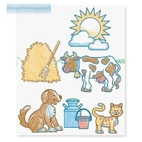 Five coloured pencils coordinate with the farm theme to add details and colour in the barnyard scene.