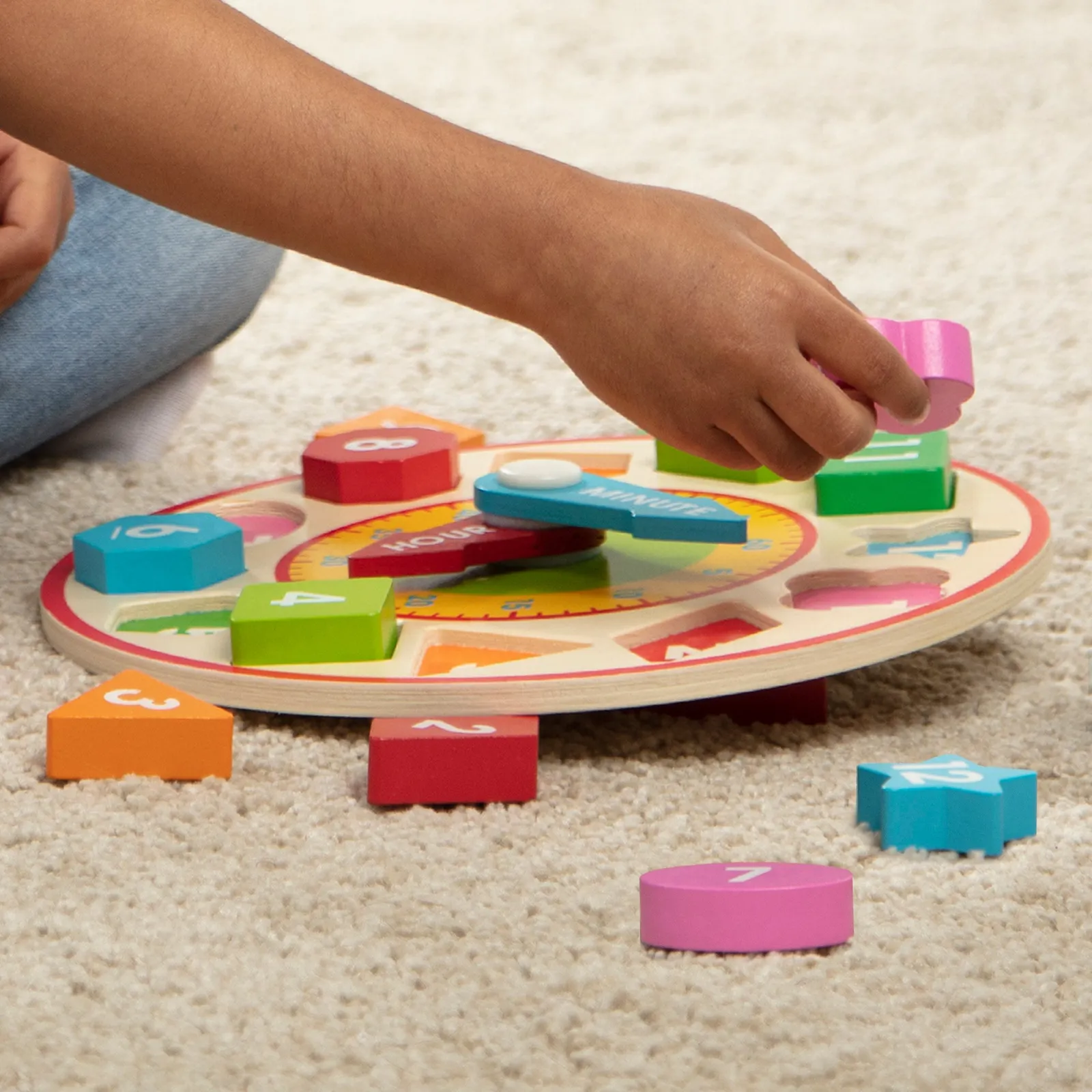 but the classic play value and top-quality construction remains the same. Kids love the color-coded minute and hour hands that spin around with a simple push. (No matter where they point, it's always time for learning and fun!) Children can match the colors, sort the shapes, and solve the puzzle as they manipulate the color blocks and turn the hands, building cognitive and motor skills and laying the groundwork for learning to tell time. Extension activities printed right on the box encourage parent-and-child play, helping children begin to master early-learning concepts as they gain familiarity with the form of a clock and concepts of time.