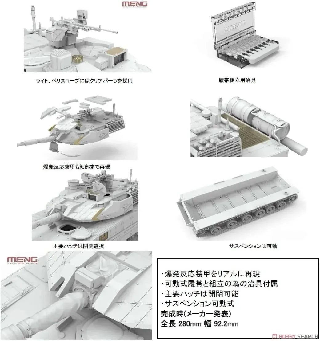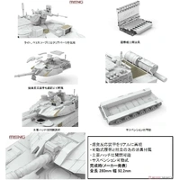 The ZTQ15 light tank was developed by the People's Republic of China, with a weight of 33 to 36 tons. The environment in which 50-ton-class main battle tanks can be operated is limited in China, and the Type 62 light tank was operated in the water town areas of southern China and the plateaus and mountainous areas such as Tibet; the ZTQ15's development began after opinions came in from the field that the Type 62 was too old. The ZTQ15's main mission is infantry support and reconnaissance missions, and it's armed with a 105mm rifle cannon. This gun is a new improvement of the 105mm 81 rifle for 59-II tanks, which is a licensed production of the Royal Ordnance 105mm tank gun L7. It is also equipped with an unmanned gun mount (RWS) as a secondary weapon, including a 12.7mm heavy machine gun, an automatic grenade launcher, and a 7.62mm coaxial machine gun. The crew consists of a commander, a gunner and a driver, and the tank seems to be equipped with an NBC defense system, air conditioning equipment, and oxygen cylinders for high-altitude activities. As for mobility, it is equipped with a 1,000-horsepower engine at the rear, can run at a maximum speed of 70km/h, and is equipped with a twin turbo in consideration of operation in a thin-air environment such as highlands. This model kit from Meng reproduces the type of ZTQ15 light tank equipped with explosive reaction armor. The shield cover is realistically reproduced, and it comes with movable tracks and jigs for assembly. The main hatch can be opened and closed after assembly, and the suspension is movable. Clear parts are used for the light and periscope, and the explosive reaction armor is also reproduced in realistic detail.