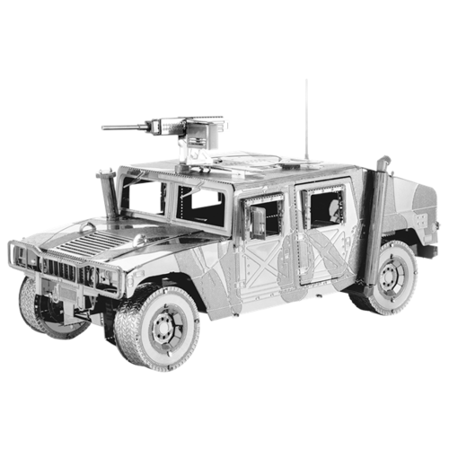 Make a BIG impression with our premium line of individually boxed DIY metal models. The Humvee is a 2 sheet model 8.3" x 4.3" it offers a larger size with enhanced details. Known by its military designation as the High Mobility Multi-purpose Wheeled Vehicle, the HMMWV is a lightweight, highly mobile, diesel-powered, four-wheel-drive tactical vehicle that uses a common chassis to carry a wide variety of military hardware ranging from machine guns to tube-launched, optically tracked, wire command-guided (TOW) anti-tank missile launchers. It must perform in a wide variety of terrain, from deserts to jungles, for long periods of time, with minimal maintenance. It has to carry its cargo and occupants in safety while dodging instruments of war x bullets, bombs and mines.