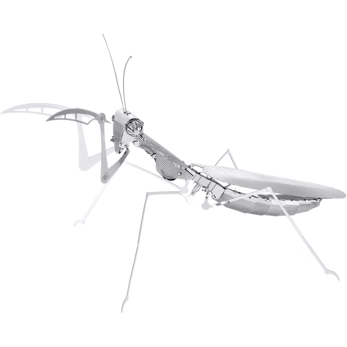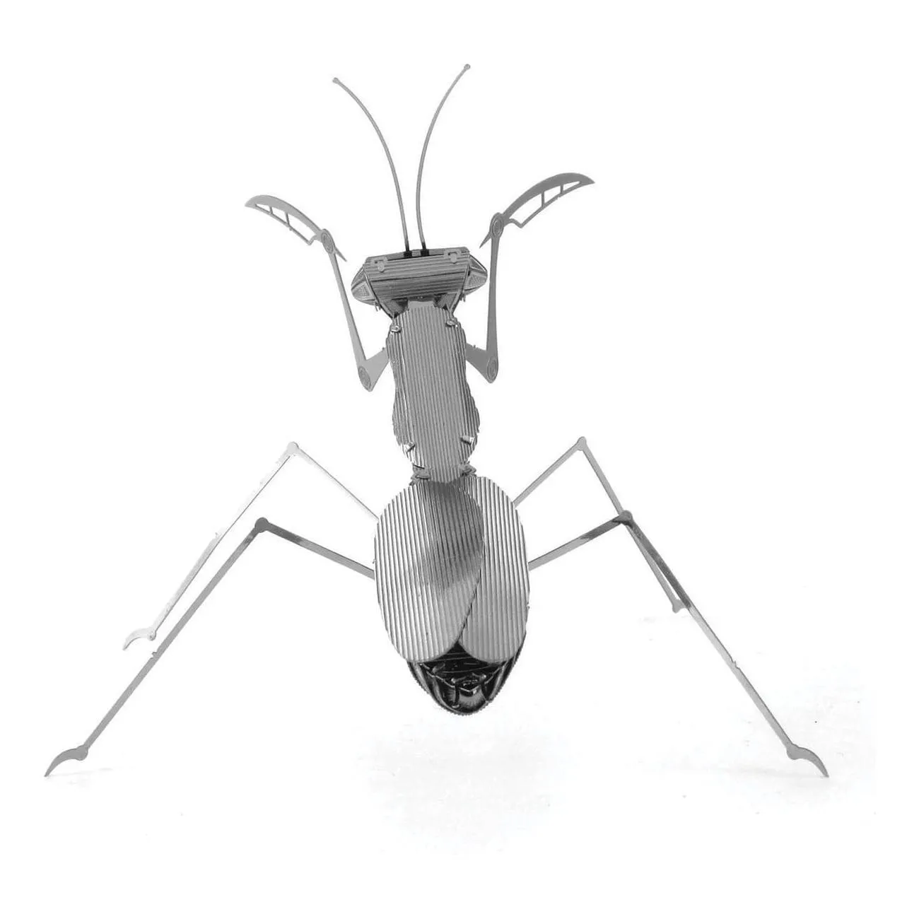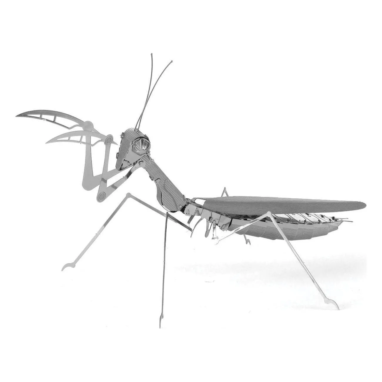 METAL EARTH PRAYING MANTIS The name comes from the Greek word meaning prophet because they appear to be praying when their forelegs are clasped together. They are carnivorous and are equipped with sharp spines along their front legs to grasp prey. The mantis is a very unique insect in that it can turn its head 180 degrees, has only one ear and some are large enough to capture humming birds. Number Of Sheets: 1 Sheet Difficulty: Moderate Assembled Size: 4.72"L x 3.54"W x 1.57"H (12 x 9 x 4 cm) Ages: 14+