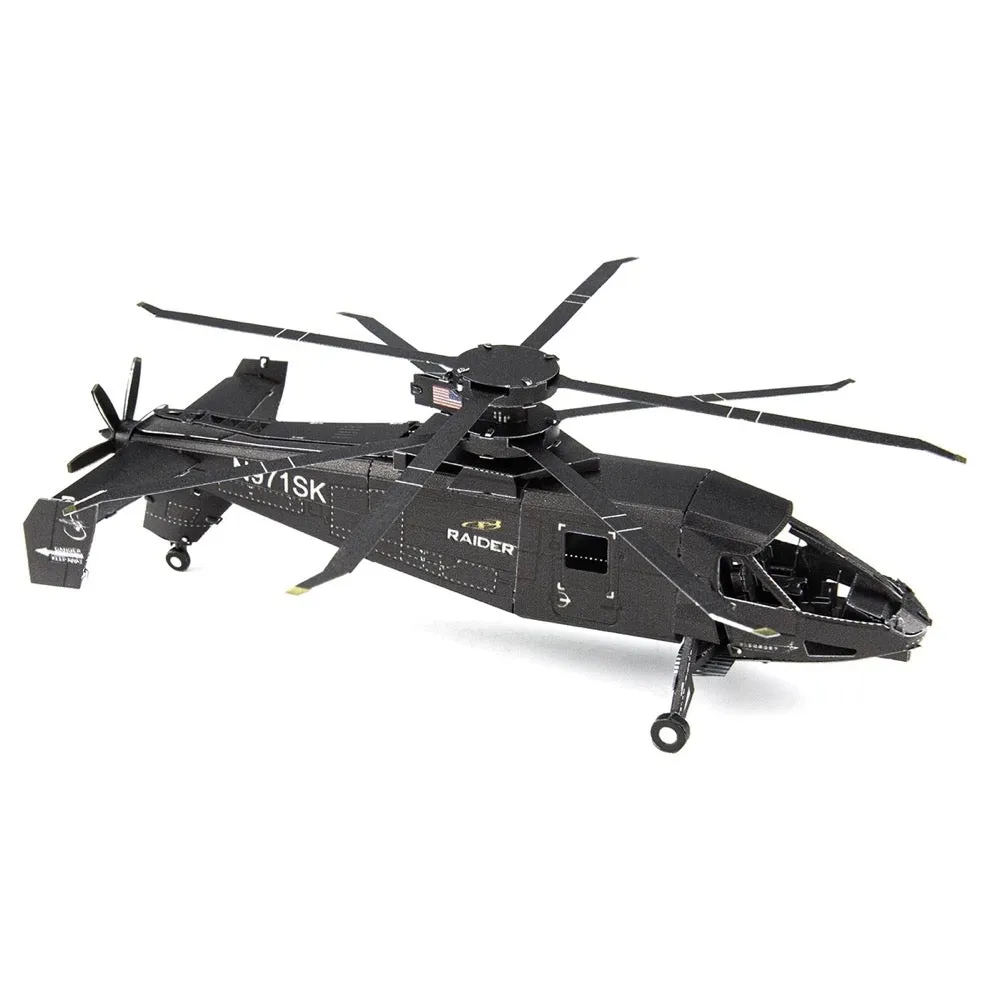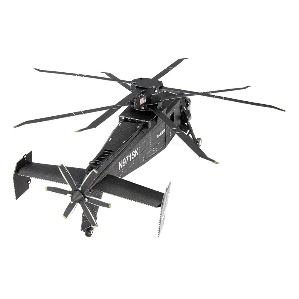 The fastest next-generation helicopter in the world, the Sikorsky® S-97 Raider® features twin four-blade contra-rotating main rotors and a rear pusher propeller, allowing for a top speed of 276 MPH. What makes the Raider even more unique is its ability to turn its rear propeller on and off for ''Whisper Mode'', allowing it to sneak up on targets. Specifications - Number of sheets: 2 Sheets - Difficulty: Challenging - Assembled Size: 4.92" L x 4.45" W x 1.69" H (12.5 L x 11.3 W x 4.3 H cm) - Ages: 14+ This is a DIY metal assembly model kit with incredible detail made from high quality steel sheets. Each models parts are cut from one or more square steel sheets. Parts are put together with NO GLUE or SOLDERING required. Easy to follow instructions are included. Long-nose pliers and bending tools are recommended. Simply cut out the parts and bend the tabs to insert into indicated attachment points. No painting required, as most are natural metal in colour while some kits may be pre-coloured. Recommended for ages 14 and over. Due to their small size and sharp corners, Metal Earth models should be kept out of the reach of children under three years of age.