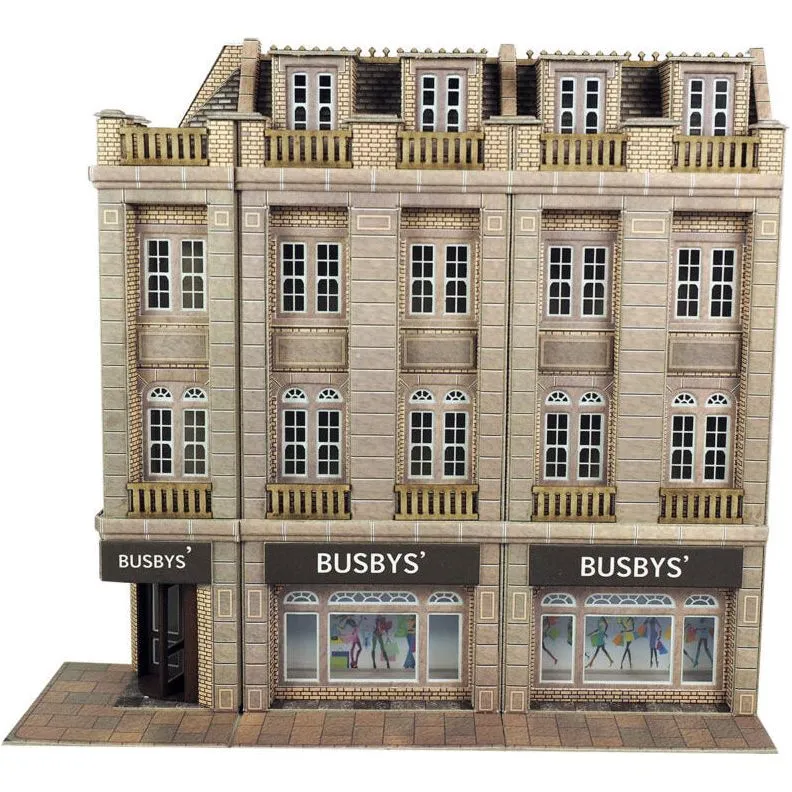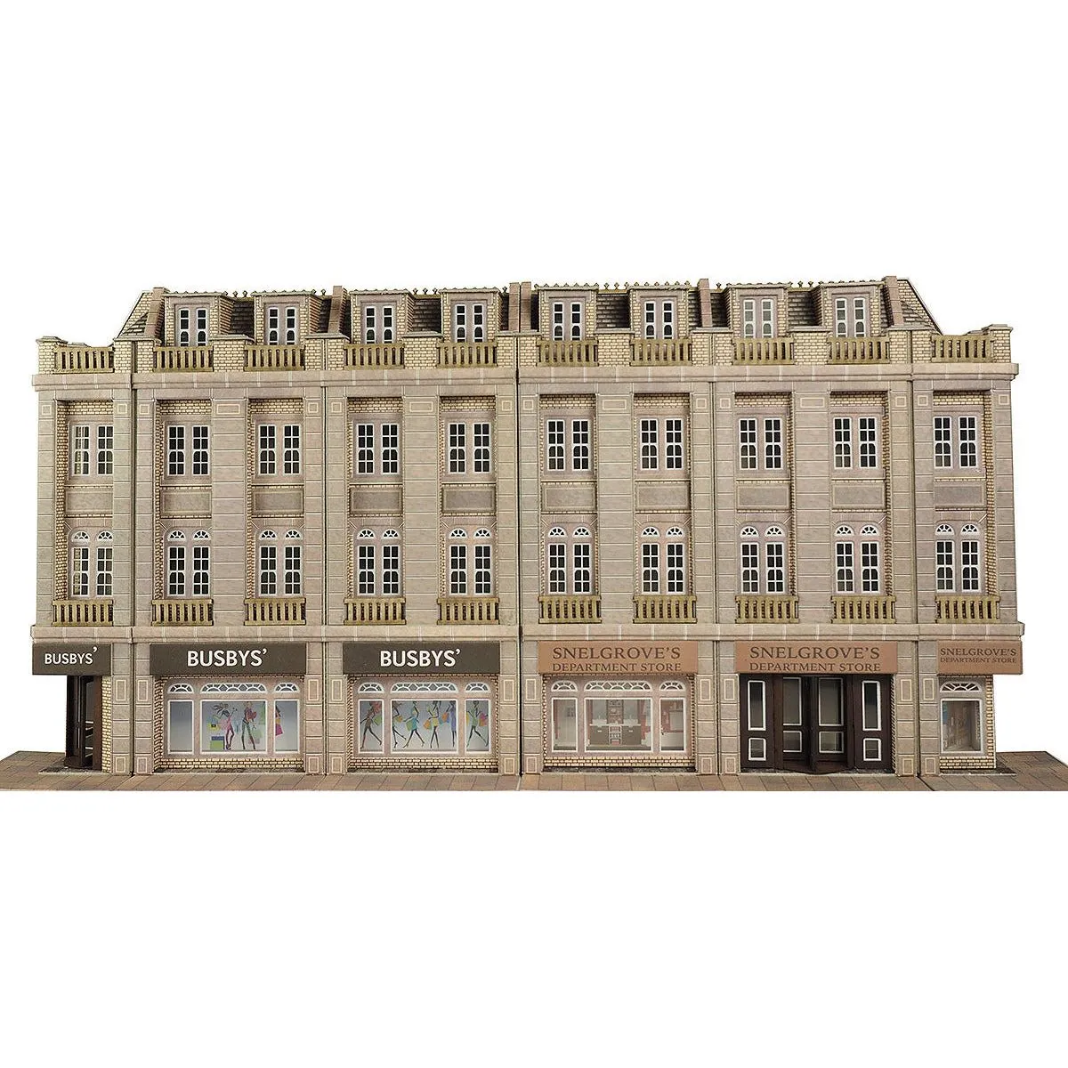 METCALFE OO/HO LOW RELIEF DEPARTMENTAL STORE An expandable kit that with the addition of more kits can built built into a truly great shop. SPECIFICATIONS The corner unit can be turned either way to fit either end of the block. Comes with a variety of doors/ window displays, signs and a working, laser cut revolving door.