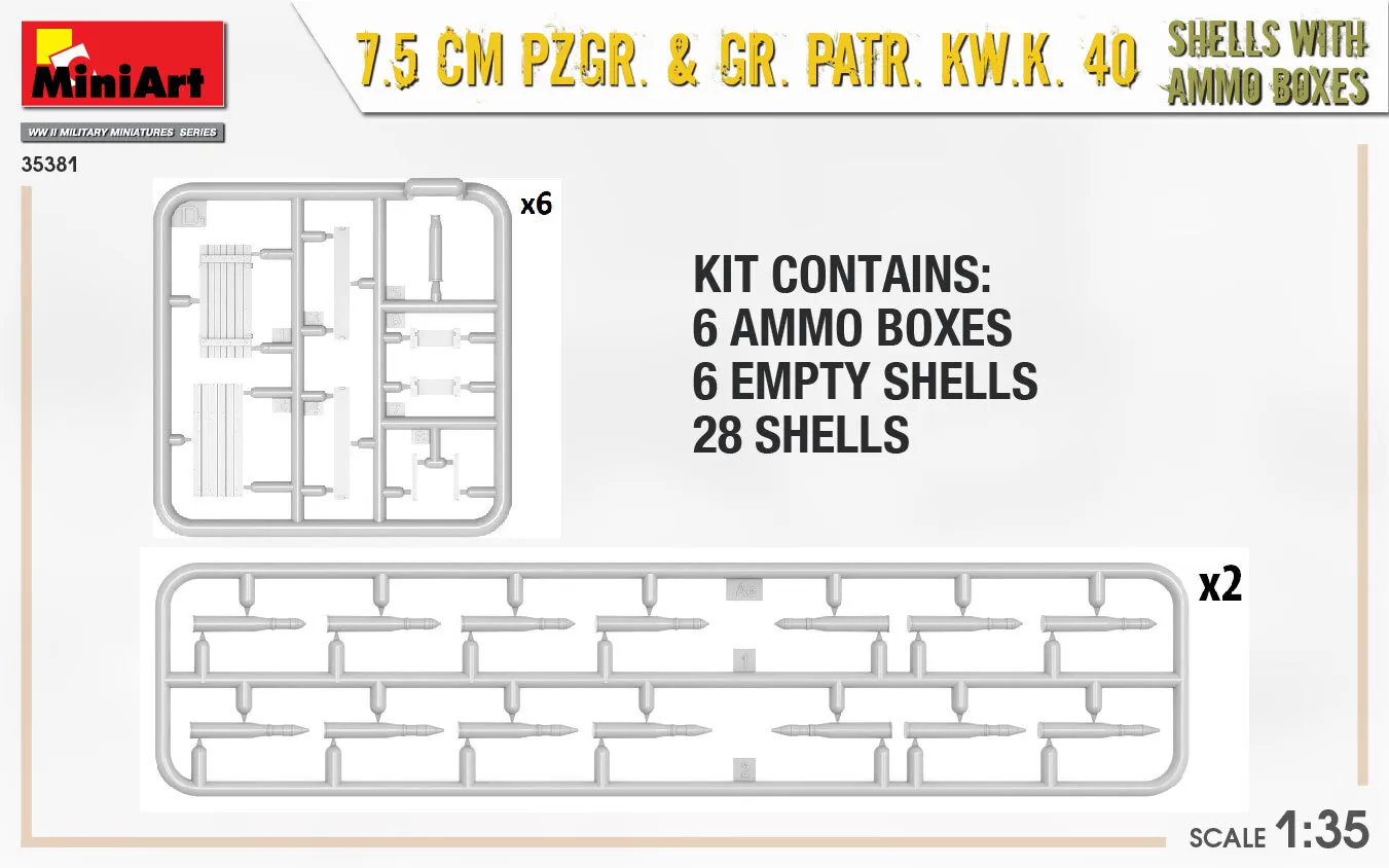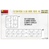 Short DescriptionMiniart 1/35 7.5cm Pzgr & Kw.K 40 Shells & Ammo Boxes # 35381