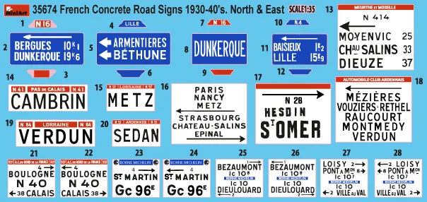 This kit offers a variety of realistic French road signs from the 1930s and 1940s, perfect for adding authentic details to your WWII dioramas. The set includes directional signs, milestone markers, and street signs commonly seen in northern and eastern France during the war.