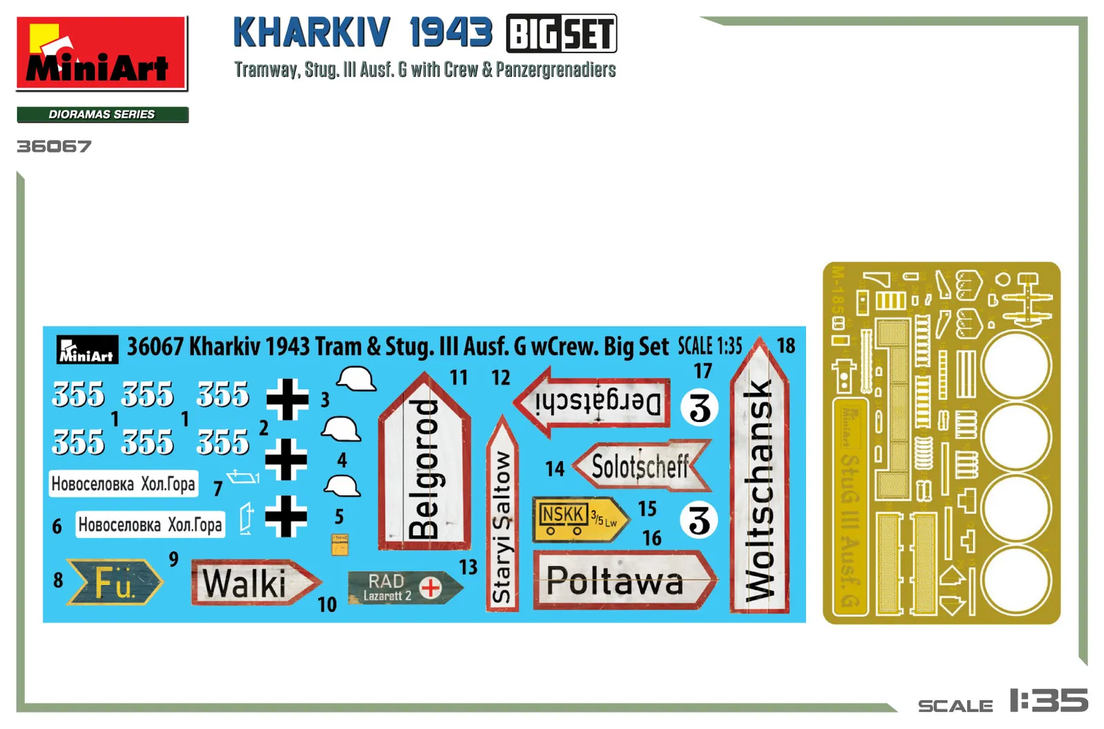 This MiniArt BIG SET captures the streets of Kharkiv during the pivotal battles of 1943. The kit includes a tram, a StuG III Ausf. G assault gun, 13 figures (crew and panzergrenadiers), road signs, and a diorama base, offering everything needed to recreate an Eastern Front scene.