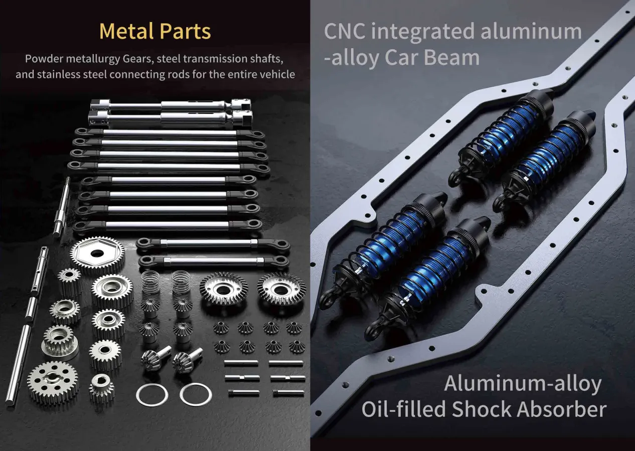 Powder metallurgy gearsm steel transmission shaft and stainless steel connecting rods throughout the entire vehicle with CNC integrated aluminium-alloy car beams, and aluminium-alloy oil-filled shock absorbers to handle anything you throw at it.