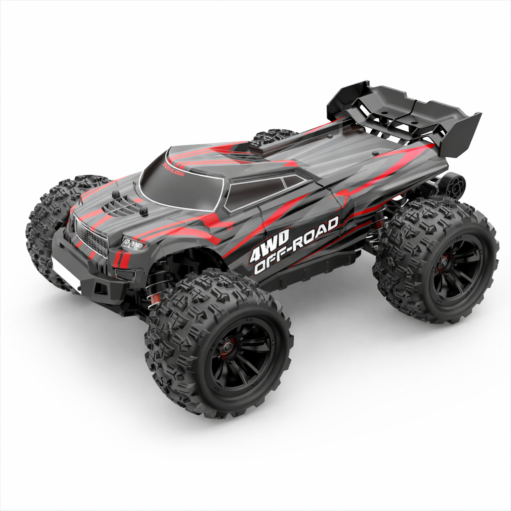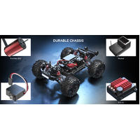 Push the throttle hard off-road and still never lose control - the Hyper Go monster truck in 1:16 scale accelerates up to 45 km/h with its 2845 brushless racing motor and ensures precise handling with regulation options. These include two adjustable top speed settings, a fast steering servo for agile direction changes, adjustable aluminium oil-pressure shock absorbers, adjustable suspension and an adjustable wheelie bar. Metal CVD drive shafts, metal propshaft and 45A brushless controller incl. active fan round off the equipment. The entire electronics are protected against splash water and allow unrestricted outdoor use. The large high-grip tyres made of soft rubber ensure full grip on any surface. In addition, the model is equipped with a bright switchable LED light for great action even in the dark. The handy 3-channel remote control transmits all functions without interference and also allows the operation of several models in parallel thanks to the 2.4 GHz system. The model is available as an RTR (Ready-to-Run) package, which means that all components - except for household batteries for the remote control - are already included.