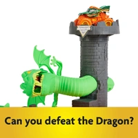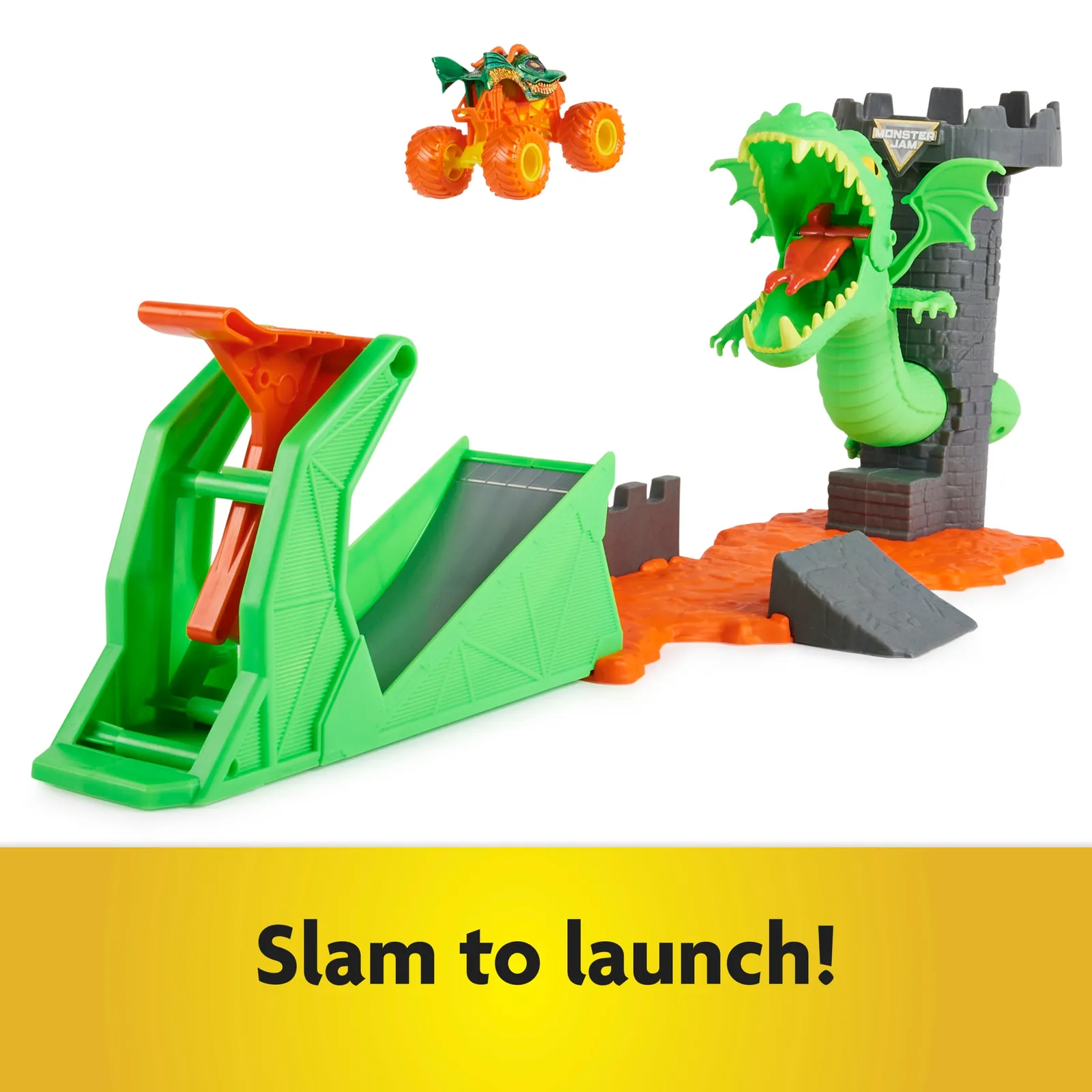 Can you defeat the dragon? Test your skills with the official 1:64 scale Monster Jam Dueling Dragon Playset! This awesome playset brings the epic Monster Jam action to life. Face the playset’s dragon head on and jump the lava with the set’s exclusive 1:64 scale Monster Jam Dragon monster truck! Pull off stunts, jumps, and flips over the lava, then prepare for your Dueling Dragon showdown! Slam the launcher to send your Dragon truck up the ramp and challenge the dragon. Be careful you don’t get caught in its mouth! Launch your toy truck just right and land on the castle turret to make the dragon fall to its defeat! To reset, rotate the dragon back into position, open its mouth, then slam and launch again and again! For even more ways to play, recreate your favorite stunts over the lava using the two smaller ramps on either side of the playset. The Dueling Dragon Playset works with all 1:64 scale Monster Jam monster trucks (toys each sold separately), so the Monster Jam action never stops! Monster Jam monster truck toys are the perfect gifts for kids ages 3 and up. Unleash high-flying Monster Jam action with the Dueling Dragon Playset!