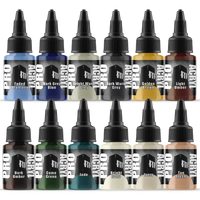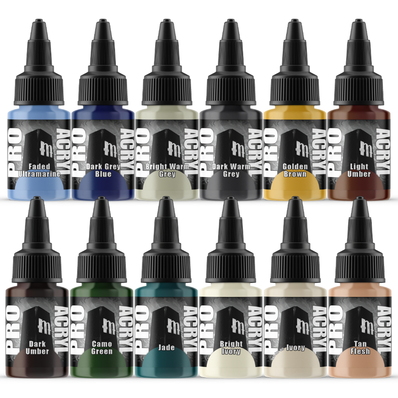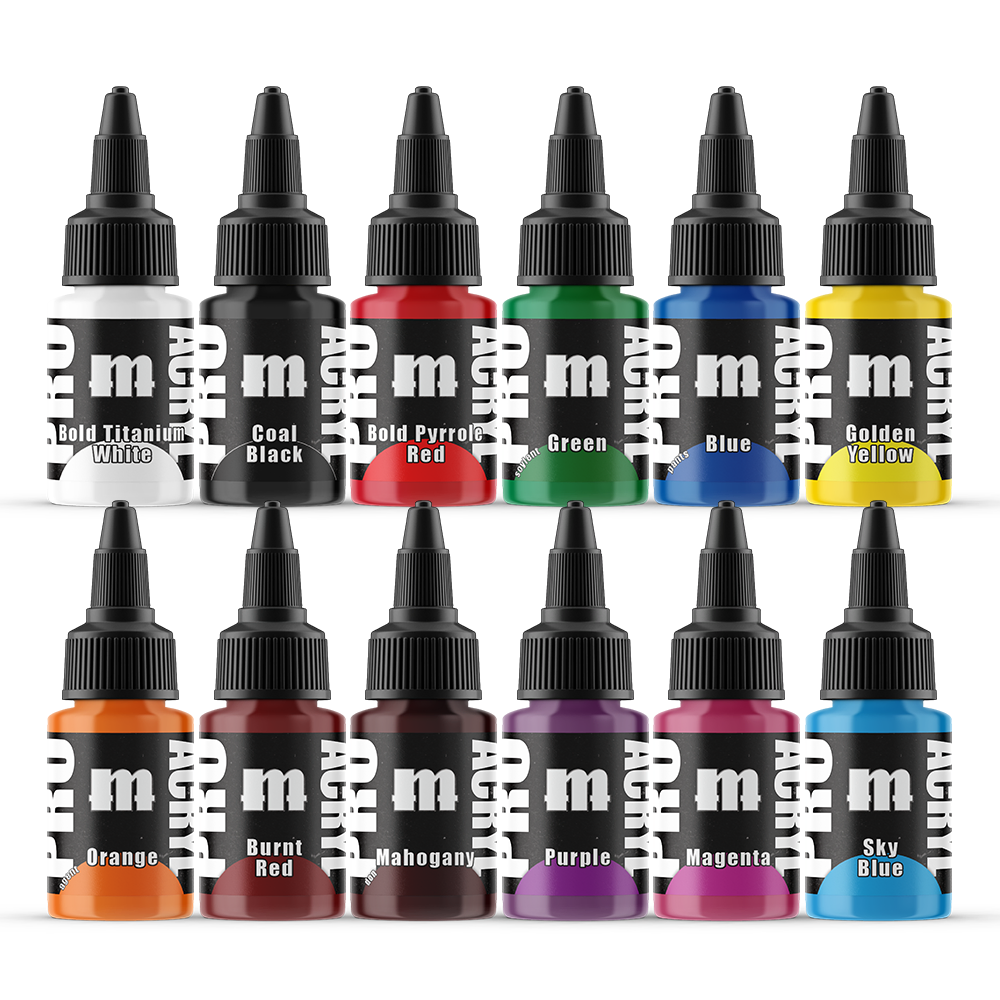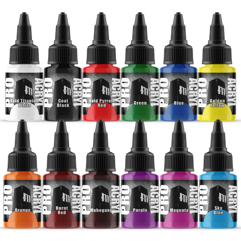 Paints included - Bold Titanium White Coal Black Bold Pyrrole Red Green Blue Golden Yellow Orange Burnt Red Mahogany Purple Magenta Sky Blue Faded Ultramarine Dark Grey Blue Bright Warm Grey Dark Warm Grey Golden Brown Light Umber Dark Umber Camo Green Jade Bright Ivory Ivory Tan Flesh