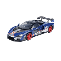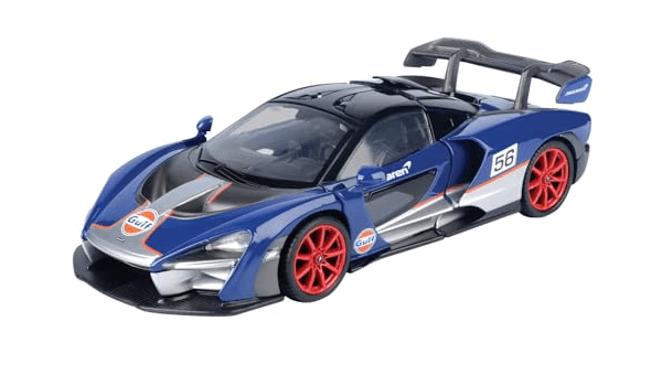 Motormax 1/24 scale McLaren Senna diecast model with Gulf Livery. Features rubber tires, operational doors, and detailed interior and exterior styling. Construction combines diecast metal with plastic components. Approximate dimensions: 7.75" L × 3.75" W × 2.75" H.