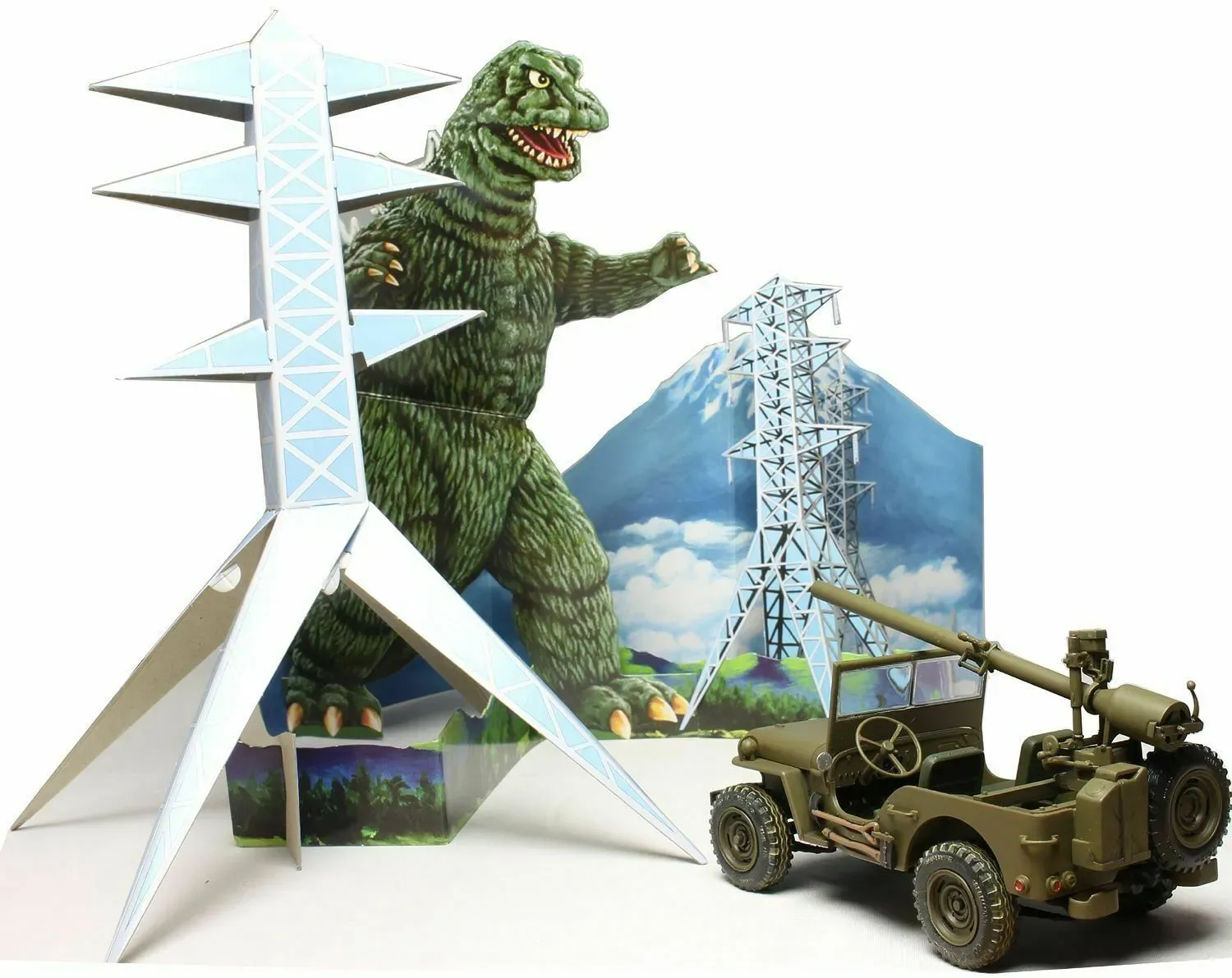 1/25 scale, skill 2, paint and cement required molded in green Includes cardboard backdrop featuring Godzilla Based on Invasion of the Astro-Monster (1965) Includes weapon options Includes US and Japanese army markings