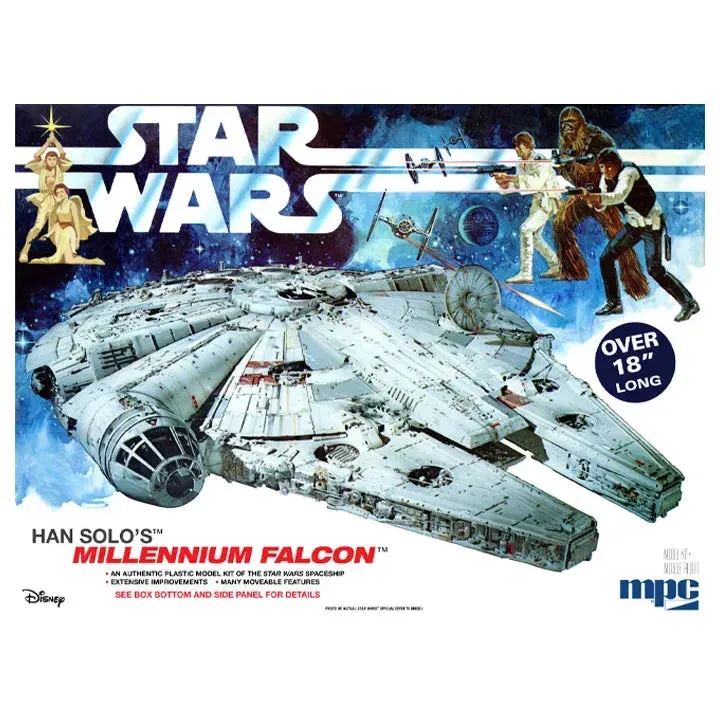 SKU: MPC953 | Brand: MPC | Product: MPC 1/72 Star Wars: A New Hope Millennium Falcon Plastic Model Kit This 1/72 scale model kit reproduces the Millennium Falcon as depicted in Star Wars: A New Hope. The kit comprises 122 injection-moulded plastic parts and includes movable laser cannon turrets, an opening entry ramp, and removable landing gear with closable doors. Assembly requires paint and glue (not included). Finished dimensions approximate 45.7 cm length, 30 cm width, and 10 cm height. Recommended for ages 14 and up. The Millennium Falcon represents one of cinema's most recognizable spacecraft designs from the 1977 film.