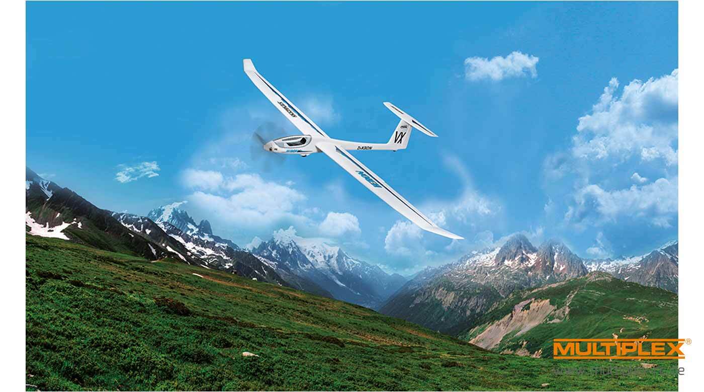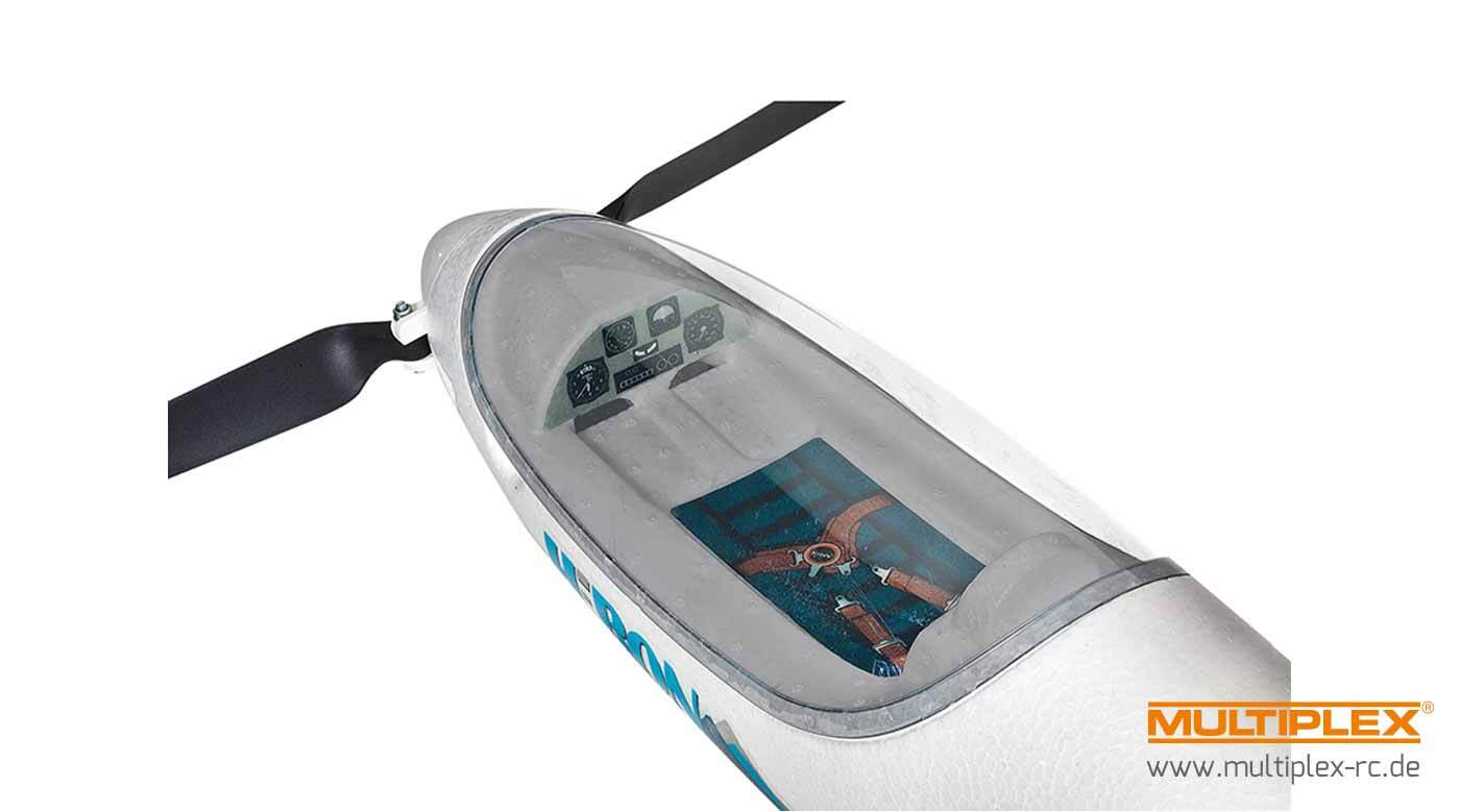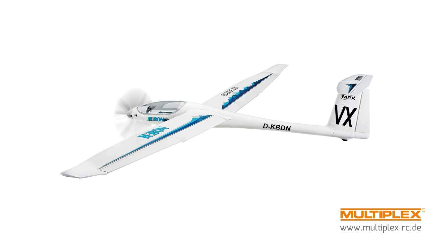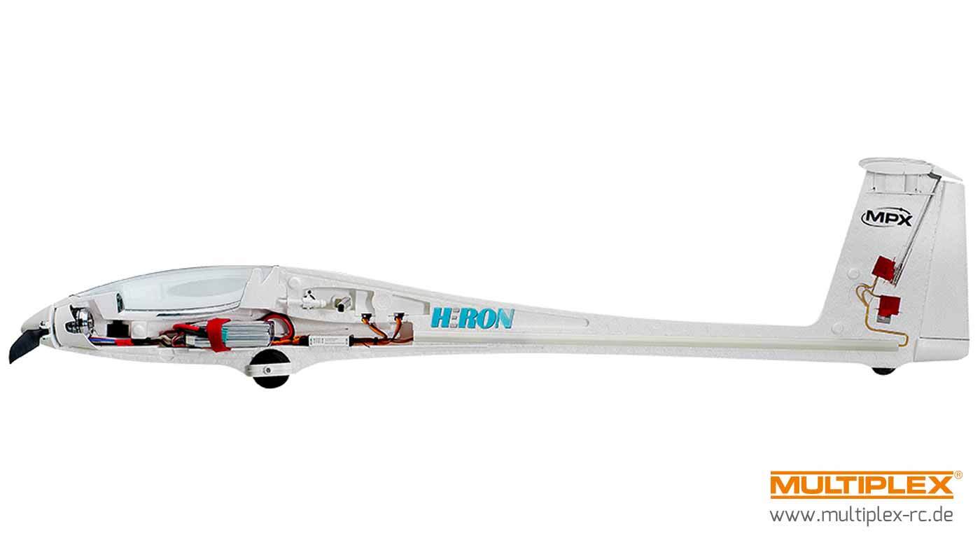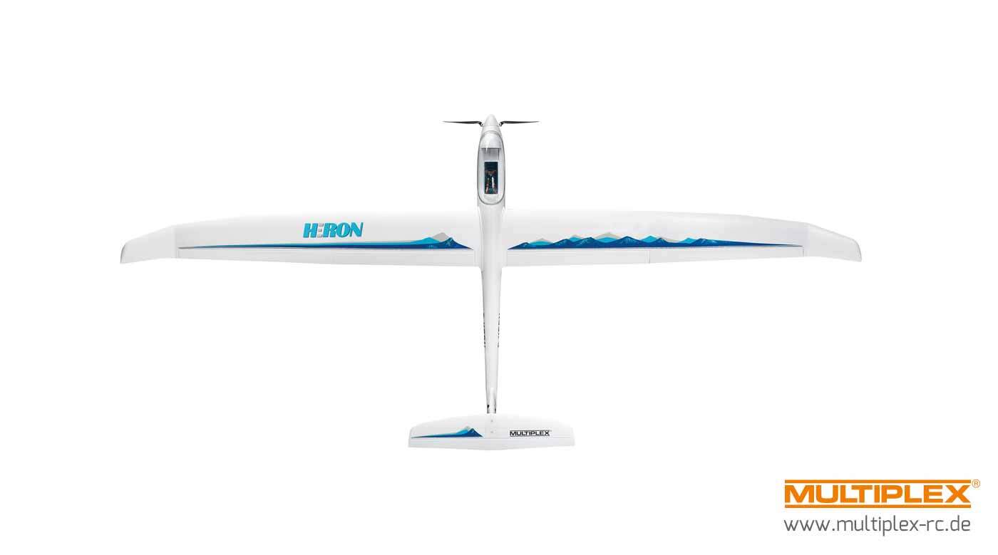 The MULTIPLEX HERON is a high-performance electric glider with T-tail and high-performance 4-flap wing.With its elegant wings and flowing fuselage, it accepts thermals excellently and, if necessary, the efficient PERMAX brushless motor drives the folding propeller (RR version) powerfully.With its uncritical flight behavior and excellent flight performance, the HERON lets you experience maximum flight pleasure, regardless of whether you are a hobby pilot or an old hand.Float through the air for a long time with elegance and precision or enjoy sporty aerobatics.The extravagant 4-flap wings with their extremely stiff CFRP / ALU tubular spar technology set completely new standards in the 2.40 meter class.With the standard flaps you land with absolute precision,