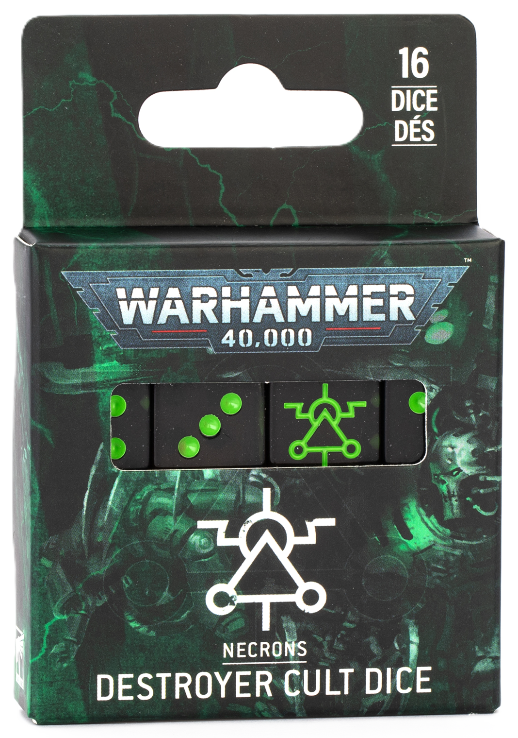 This is a set of 16 six-sided dice with squared edges for use in games of Warhammer 40,000, themed around the Necron destroyer cults. They are cast in black gem-effect acrylic plastic with light green ink markings, and measure 16mm along each edge. The 1-5 facings are traditionally pipped, and each '6' face is decorated with the twisted icon of the Necron destroyer cults.