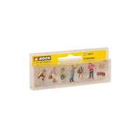 Harvest workers with accessories The set for the H0 scale (scale 1:87, approx. 2 cm high) includes six harvest helpers with matching accessories. A woman in a grey dress and a yellow apron carries a basket with freshly picked fruit in her hand. A man in a yellow sweater and brown dungarees kneels on the ground to put the apples into the basket standing next to him. The man in beige pants and a brown jacket also bends over to pick up the apples. The man in the pink shirt and blue pants is holding a fork. Another male worker is wearing blue dungarees. He stands next to a full basket of apples and puts one hand on his hip while waving to another person. The last worker wears clothes in different shades of green and kneels on the ground. In his hands, he holds his work tools. To protect themselves from the sun, the harvesters wear hats. The miniature figures are ideal for decorating rural scenes.